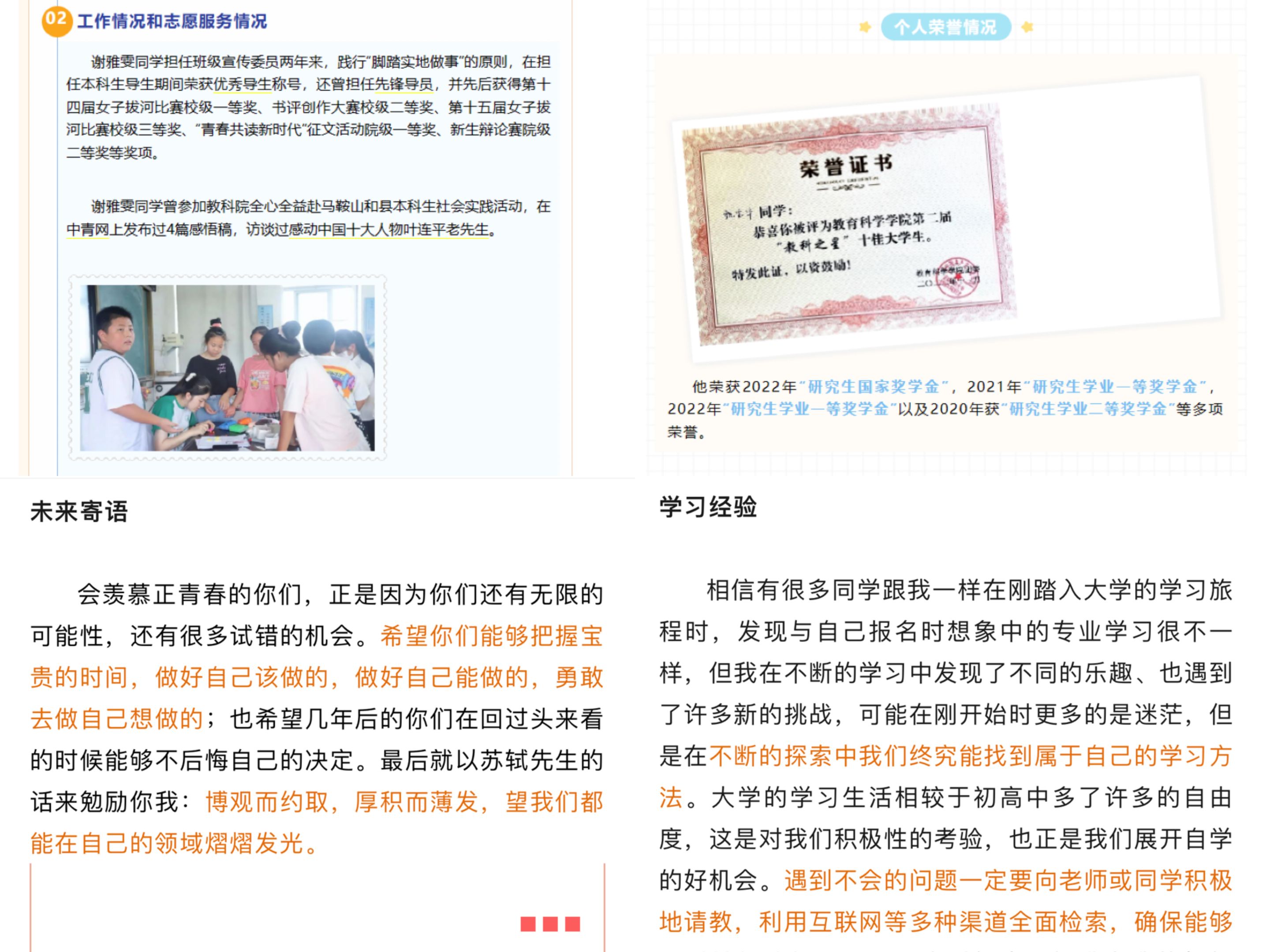 青春之我自强不息,先进个人展露风华。为发挥榜样引领作用,激发教科学子的进取精神,院团委对“教科之星”十佳老员工和保研、考研学子光荣榜进行了推文推送,并于田楼B座教科院一楼大厅展示了2023届考研光荣榜。推文具体介绍了十位“教科之星”的日常表现及获奖情况,他们德、智、体、美、劳全面发展,在道德示范与创新创业等方面各有所长;保研、考研学子成绩优异,获得多项荣誉,在推文中分享了自己的学习经验以及对学弟学妹们的未来寄语。