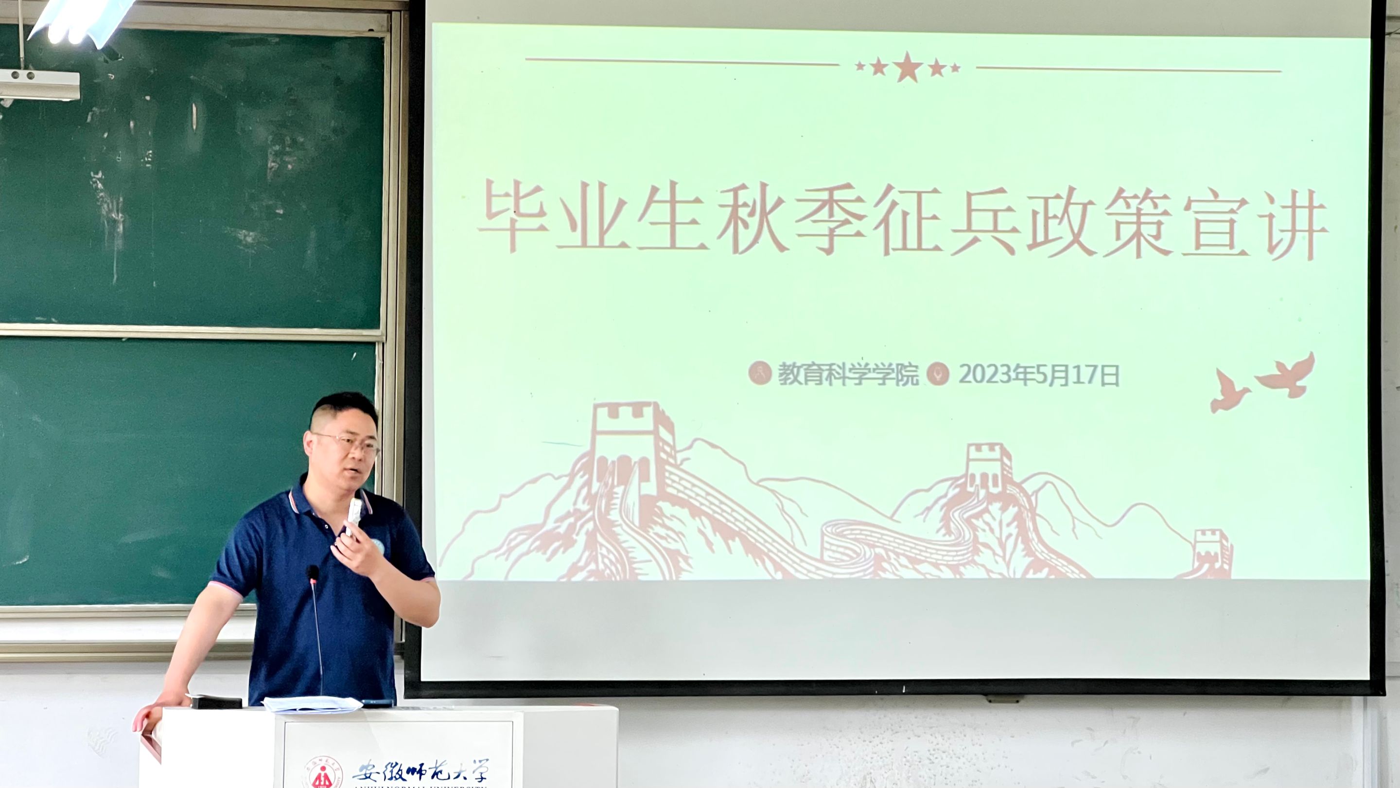 为鼓励教科学子携笔从戎、为国效力,2023年5月17日,公司于田楼8101教室开展毕业生秋季征兵政策宣讲工作,宣讲会线下线上相结合,会议由2019级辅导员莫大贡主持,2019级全体本科毕业生参加。