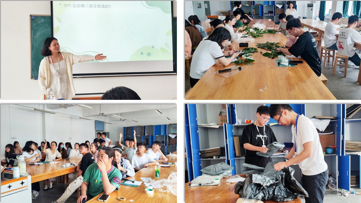 社团通过自主报名的方式选拔两位讲师为大家讲解内容。5月21日下午,社团于田楼8502教室举办第一课时活动。在此课程中,讲师首先借助PPT、视频和小游戏向同学们讲解春日花朵、树叶间的不同的纹理和形状,带领大家感受大自然的美丽和神秘。工作人员向参与同学分发花朵、树叶、印染绘画材料等工具。大家先在纸上用花朵和树叶拼凑出一幅幅栩栩如生的画面,接着用胶带纸将植物固定在画板上,再用锤子将植物内部的水分和色素敲打出来,撕开胶带后得到一幅幅春的画卷。大家相互交流自己的精美作品,分享心得感受。