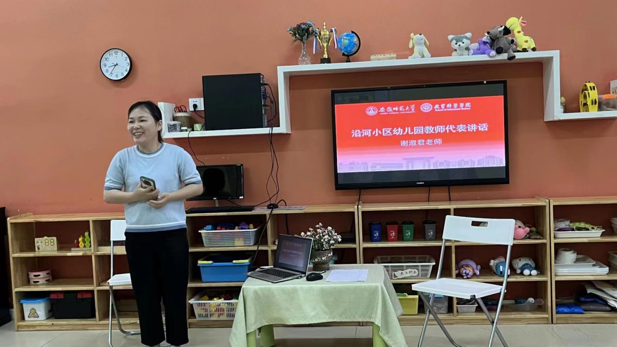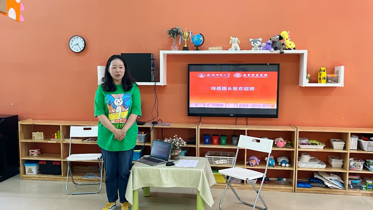 参观过后入园仪式正式开始,邱蓓园长代表沿河小区幼儿园进行发言,她对教科院学前教育专业员工的到来表示热烈欢迎,总结了近年来沿河小区幼儿园的发展历程、班级规模等基本概况,鼓励教科院的员工要与幼儿园教师携手共同学习进步。
