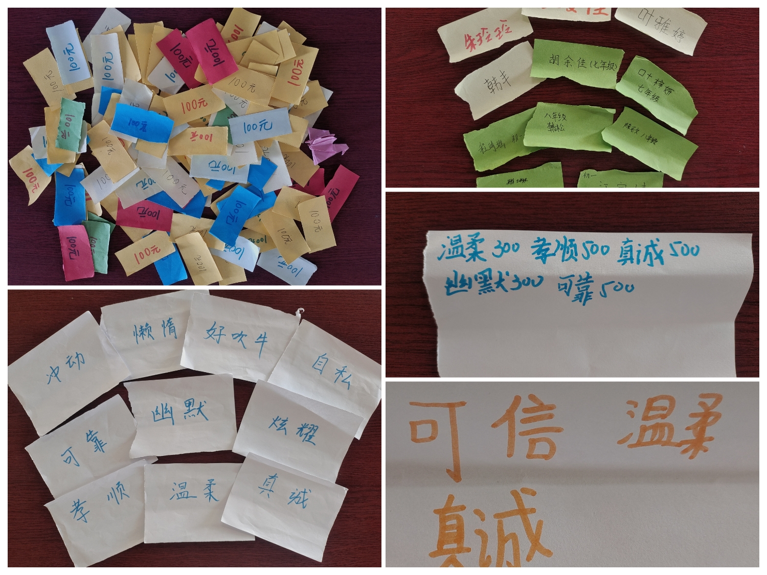 接下来,团队进行了一个名为“品质拍卖会”的活动。活动开始前,员工们会得到一些“虚拟”纸币,这些“虚拟”纸币均是由大家共同合作完成。进入拍卖环节后,每个同学都有机会使用手中的纸币竞拍自己认为最珍贵的品质。进行两次拍卖后,课堂气氛也变得十分活跃,大家积极地分享了竞拍各种品质的原因,并表达了对朋友的期望。队员和孩子们也在一次次拍卖活动中收获幸福与快乐。