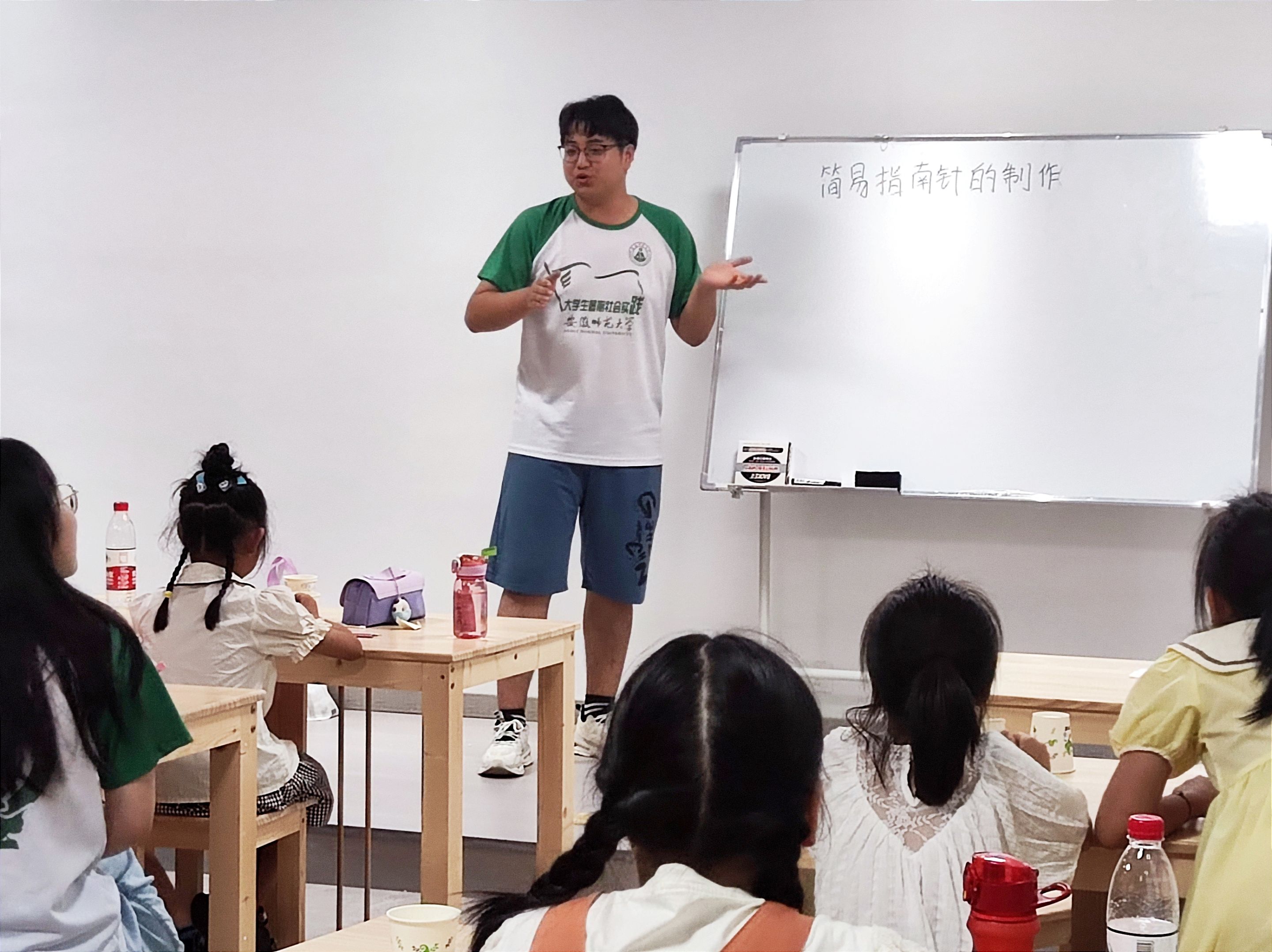 在物理课上,周旭利用水杯、水、纸片、磁铁、回形针等工具教导同学们制作简易的指南针,通过有趣的实验让员工们从动手实践中掌握磁铁的特点,并明白了它的原理:地球拥有磁场才能让带有磁性的回形针指向南方。