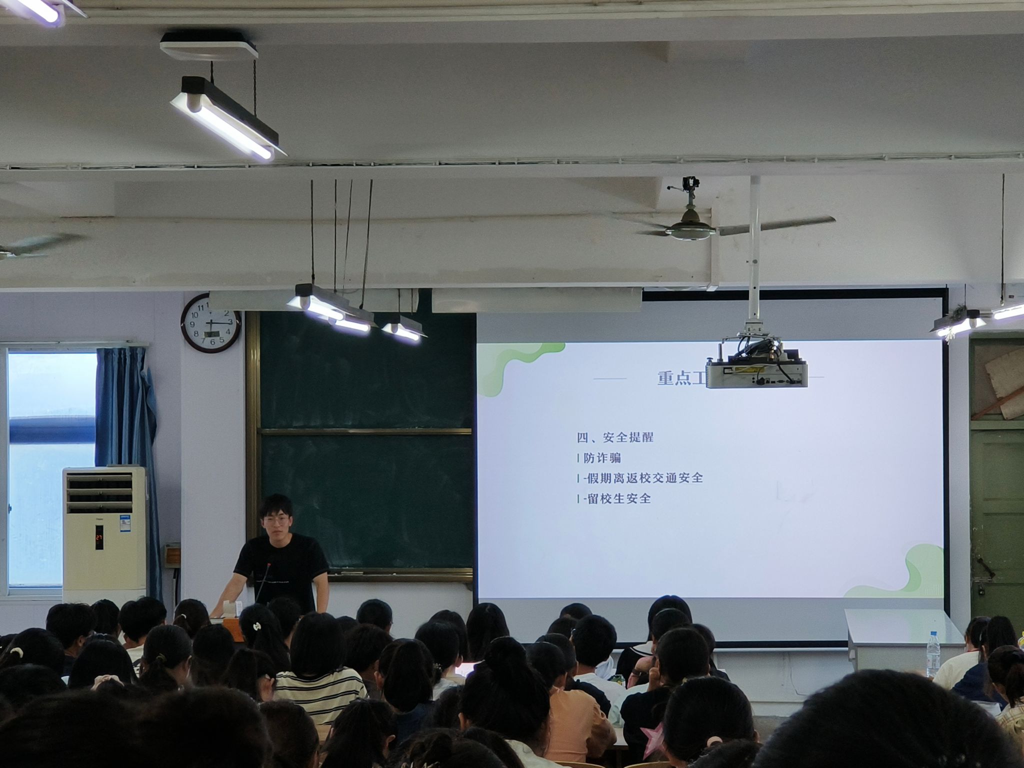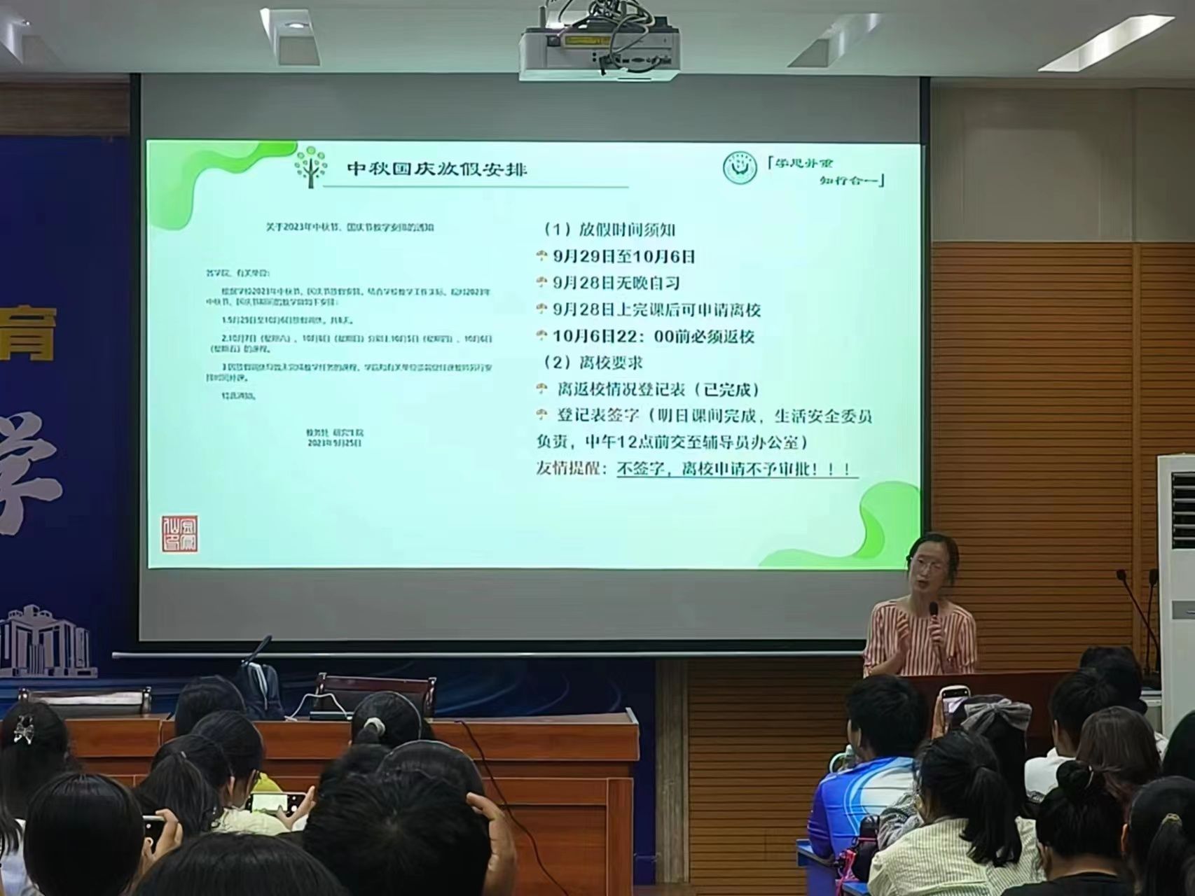 为规范国庆假期离返校程序,保证员工安全,9月27日,公司分别于实验楼401和图书馆报告厅召开2023级本科生国庆假期离校主题班会,班会由本科生辅导员金凤仙、刘玉瑾主持,全体本科生参与。