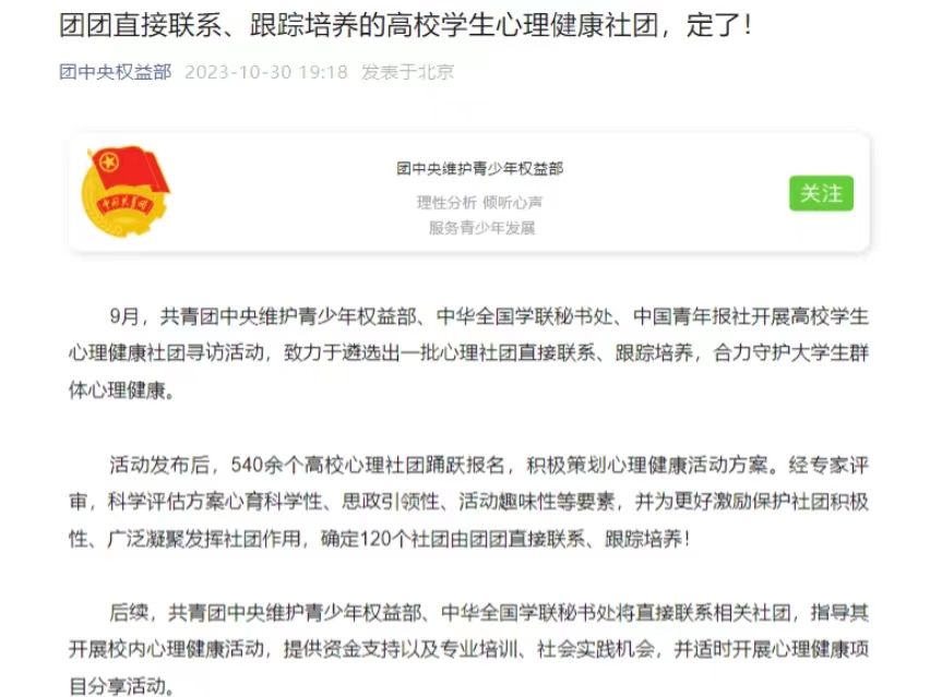 9月,共青团中央维护青少年权益部、中华全国学联秘书处、中国青年报社开展高校员工心理健康社团寻访活动,致力于遴选出一批心理社团直接联系、跟踪培养,合力守护老员工群体心理健康。