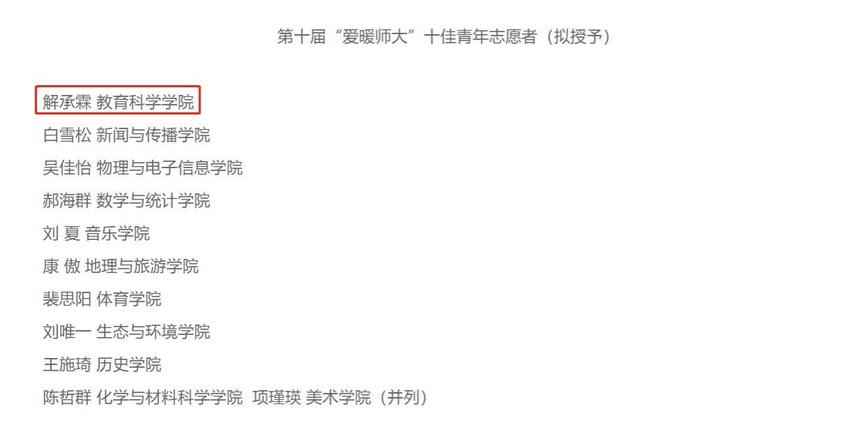 解承霖大一入校便积极报名成为“迎新志愿者”,积极参与无偿献血,应聘“绿色大使”,清扫校园街道。2023年初,受邀成为2023柏林国际特奥会的中国区志愿者代表,讲述中国故事,分享中国经验。在为期一周的青少年领袖峰会上,解承霖和智力障碍运动员和来自三十多个国家和地区的代表一起生活工作。三年以来,解承霖个人被中央电视台、国际特殊奥林匹克组织采访报道,志愿服务事迹被中国青年网、安徽日报等主流媒体多次报道。