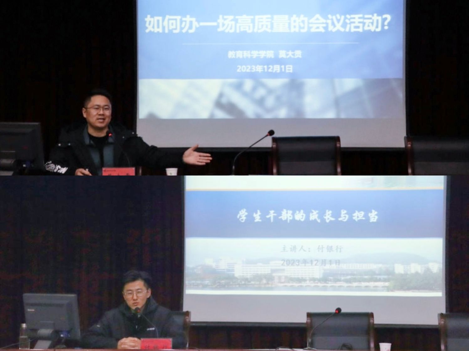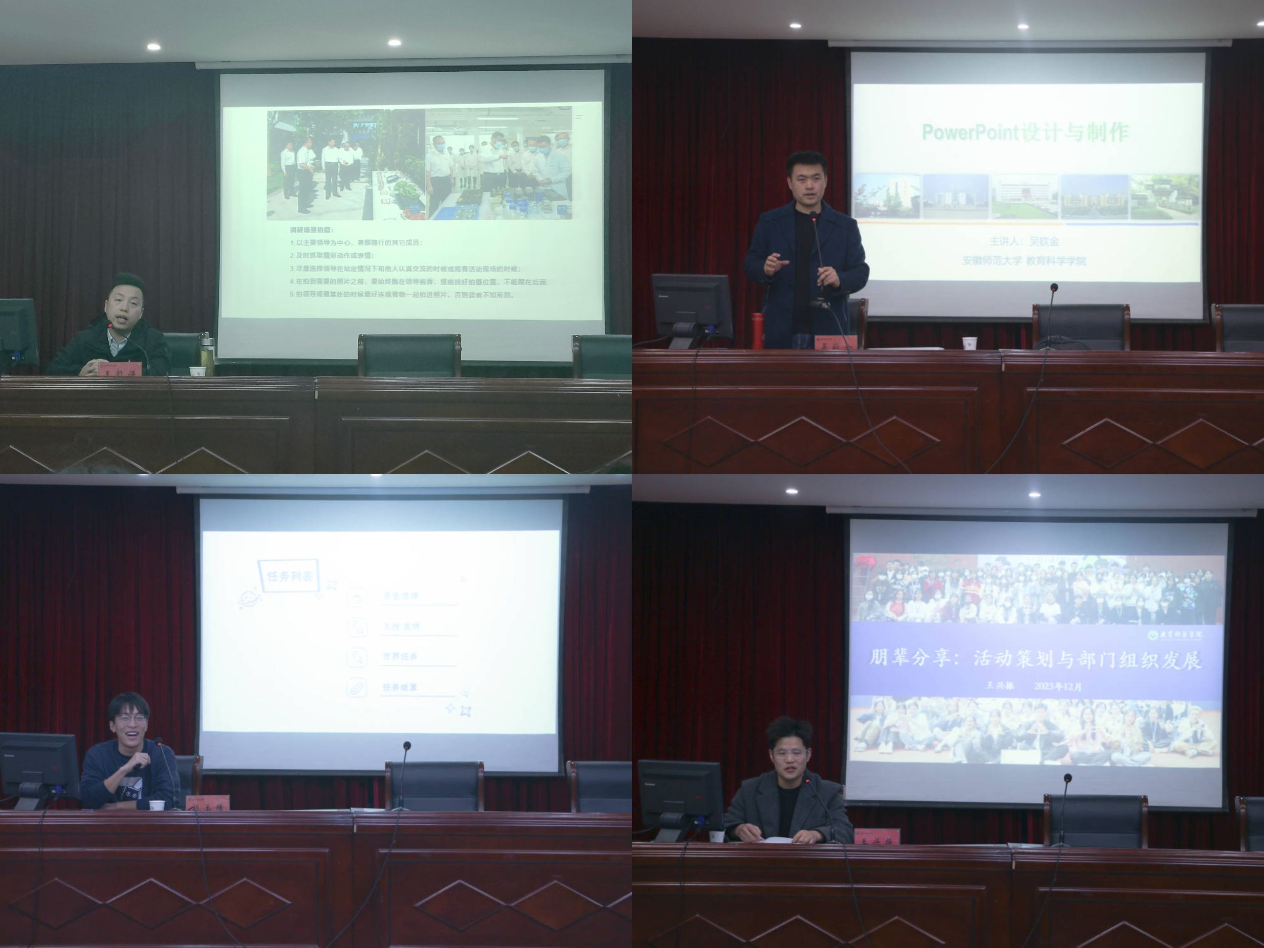 技能成才是每一位教科学子的担当与使命。公司党委宣传部王哲谦老师开展《新闻稿的撰写和摄影》主题讲座,详细地介绍了新闻稿的相关知识及新闻稿撰写的注意事项,并结合自己拍摄的图片讲述摄影技巧。教育技术学专业教师吴钦金开展《PPT的制作》专题讲座,他结合实际的案例详细讲述了与PPT制作相关的排版、美观性、逻辑性等方面的内容,鼓励各位同学在日常生活中加强练习,不断提高PPT制作能力。23级辅导员刘玉瑾结合自身在本科阶段及研究生阶段的学习生活与支教经历进行了《时间与工作的平衡和志愿服务活动》专题讲座,为同学们平衡学习与工作提供了有效的方法与手段,勉励各位同学积极参与志愿服务,提升综合素质。2020级教育技术学专业王兴振在《部门建设和身份意识的转变》专场讲座中结合自己在员工会的工作经历现身说法,强调身份意识的重要性以及部门建设过程中的注意事项,鼓励各位同学为部门建设贡献自己的力量。校团委老师王申振倾情为我们讲解了“挑战杯”相关项目,他结合具体案例具体分析重点讲述了“挑战杯”计划书的撰写与汇报PPT的制作并鼓励员工发挥专业所长积极投身“挑战杯”相关赛事中,不断提升自己的能力。