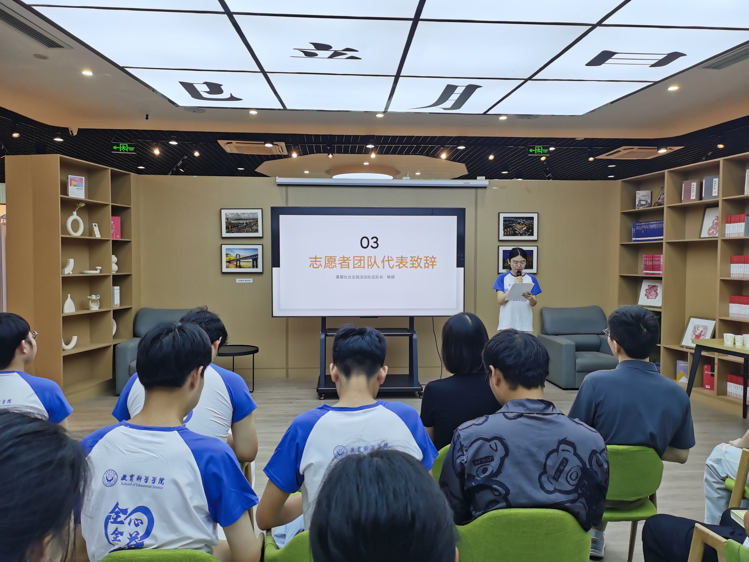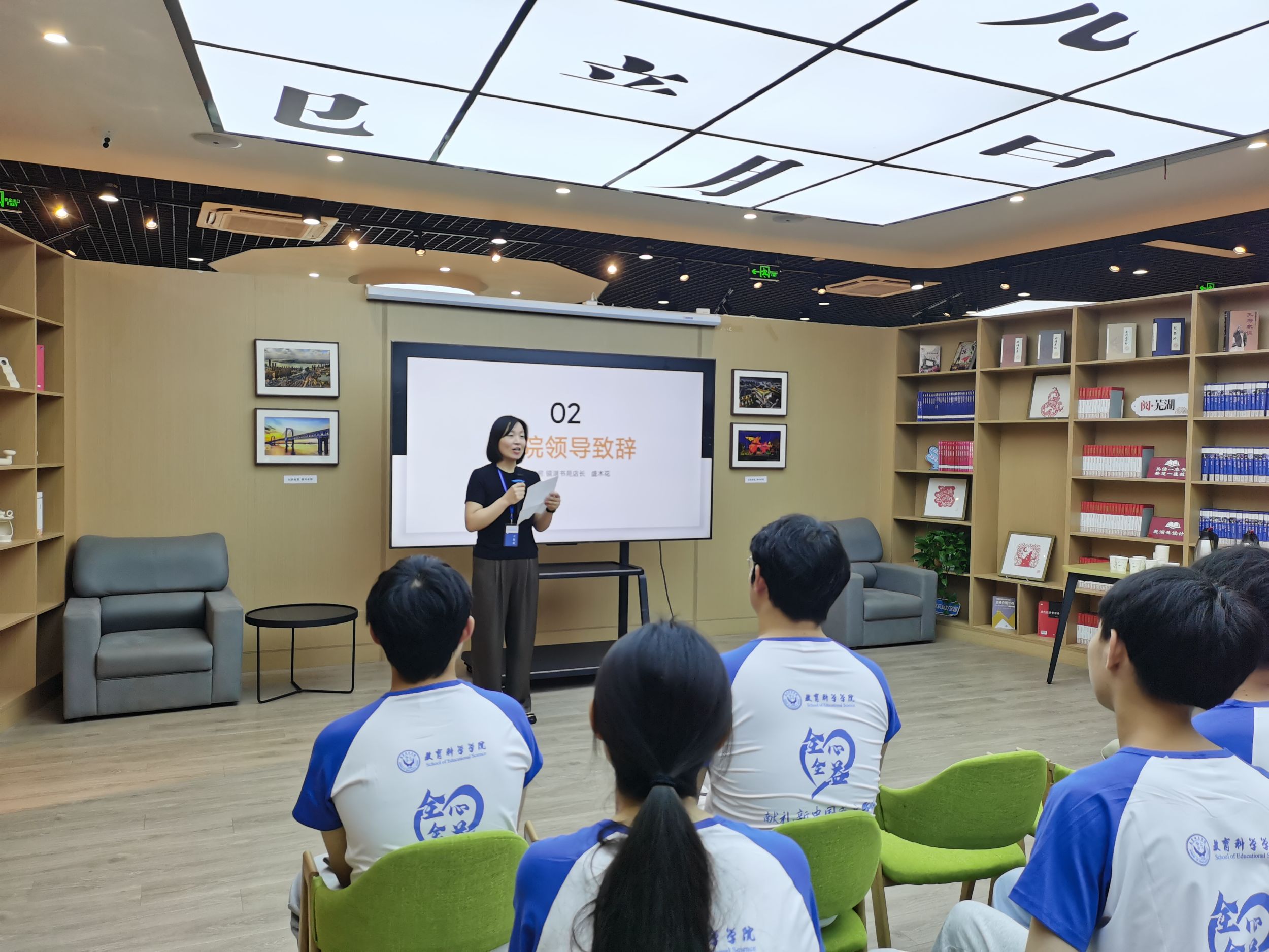 镜湖书苑店长盛木花进行致辞,对实践团队的到来表示欢迎,对于未来为期十天的活动,她期望团队能够以实际行动传递温暖,用智慧启迪小读者的心灵。同时,她向团队成员介绍了书苑现状与文化历史。最后,盛木兰对本次的合作表示期待与祝福。