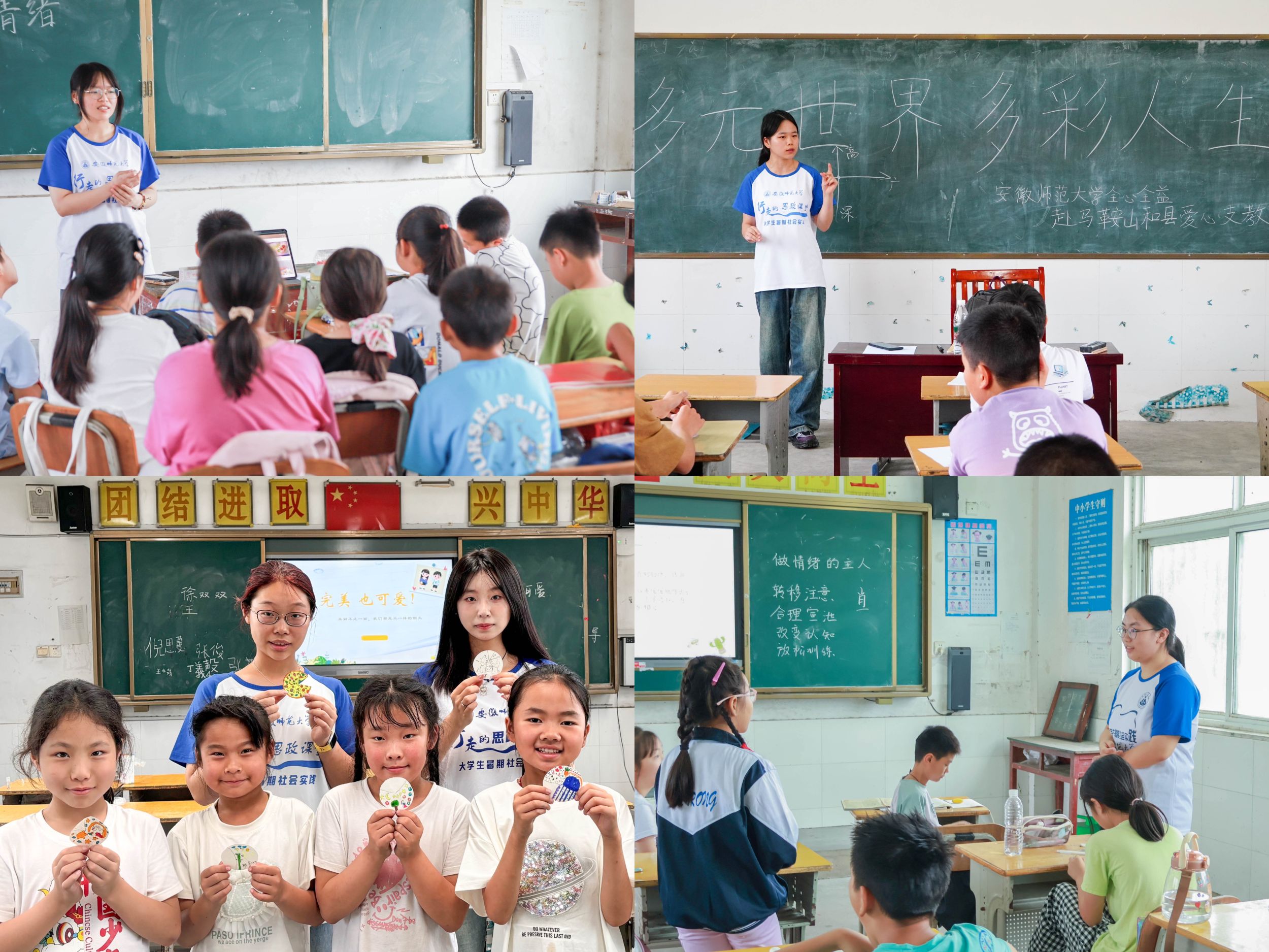 实践团队依托心理学专业特色开展丰富多彩的心理课堂,通过讲解心理健康知识,让同学们了解心理健康概念,提升与人沟通、情绪管理、自我认知等多方面能力。各支教点相继开展《认识自我,接纳自我》、《做情绪的主人》、《拒绝霸凌》等一系列课程。在课堂上,实践团队成员充分展现心理课堂的趣味性、科学性、成长性等,并综合运用启发式、情景式、探究式等多种教学方法引导员工阐述自己的观点,分享自己的收获。同时还充分利用游戏互动的形式,提高员工的课堂参与度。课堂气氛活跃,员工参与度高,在欢乐中收获知识,在实践中不断成长。