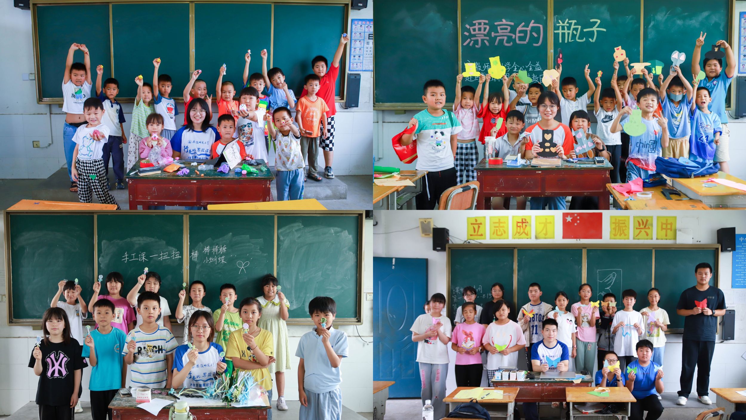 志愿者们根植和县当地传统剪纸文化资源,以课程方式开展非遗传承活动,开展特色剪纸课程,培育当地留守儿童的文化归属感。此外,为丰富儿童的课余生活,提升他们的动手能力,志愿者们还开展了丰富的手工课程,例如:粘土课、扭扭棒课、折纸课等。课堂上,同学们全情投入,展现了出色的创造力和精细的动手能力,作品独具匠心,令人惊喜。各项手工课程稳步有序推进,为教学作品“童心义卖”活动的顺利进行做好前期准备工作。