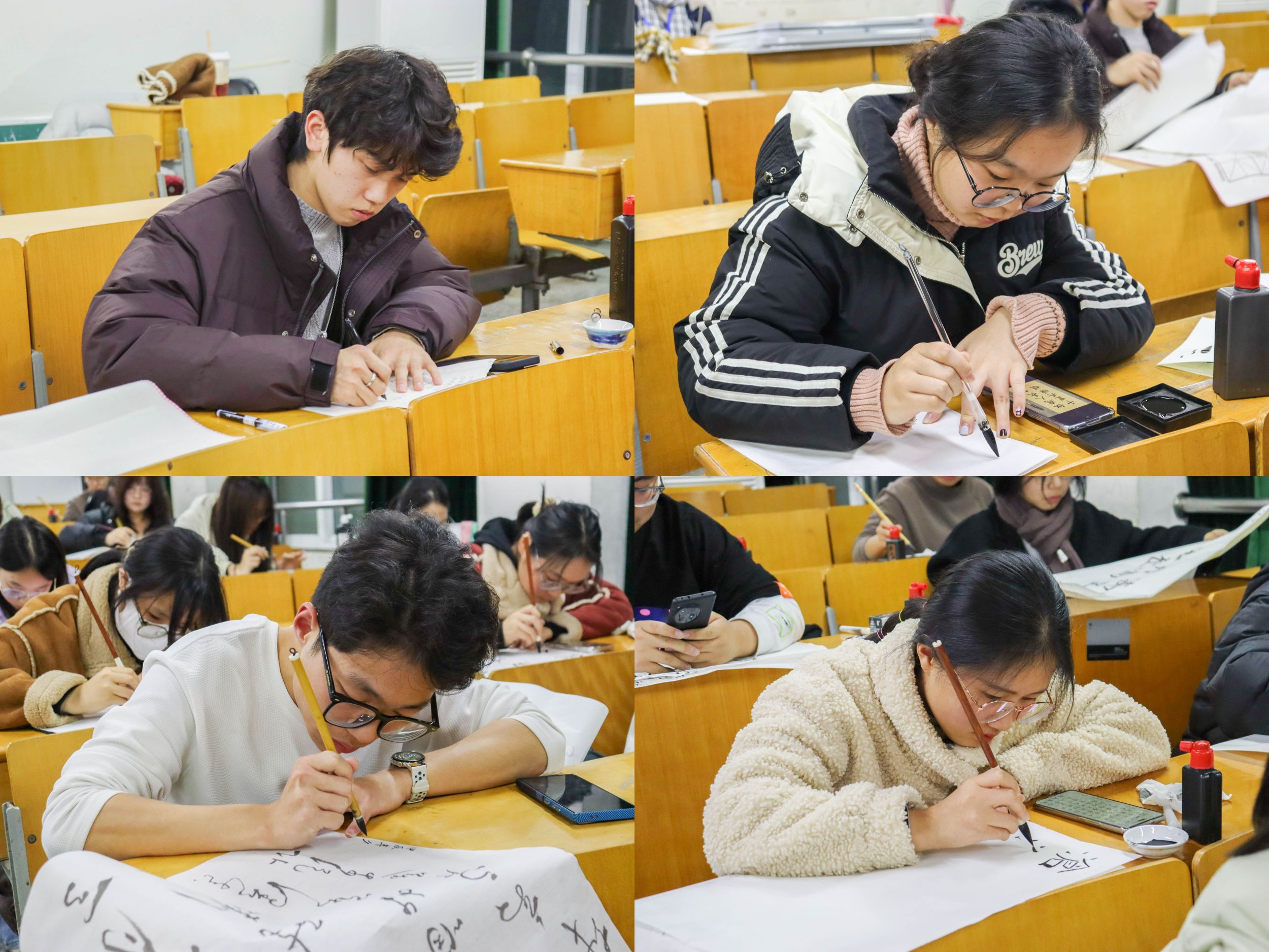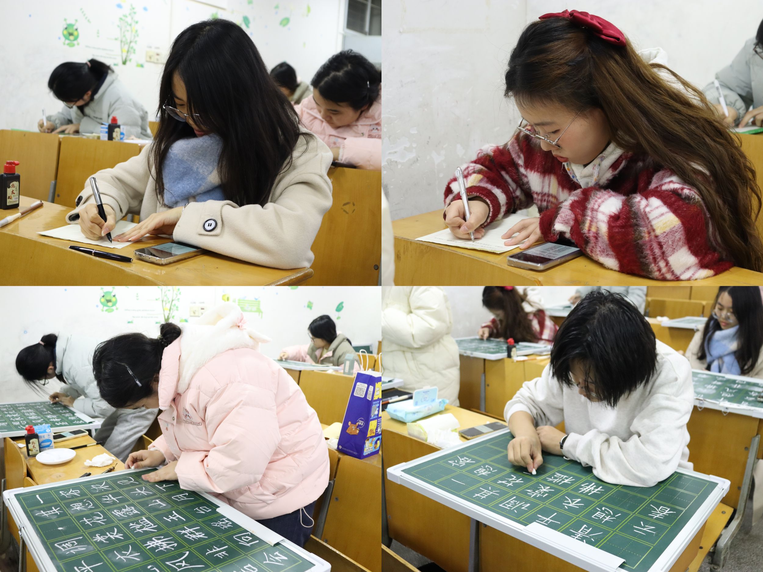 本次比赛包含粉笔字、钢笔字、毛笔字,参赛选手分三组同时进行。比赛过程中选手们认真书写,一笔一划,落笔沉稳,笔尖在纸上摩挲,发出细微的沙沙声,他们的笔触细腻流畅,笔画粗细均匀,字里行间尽显优雅与精致。