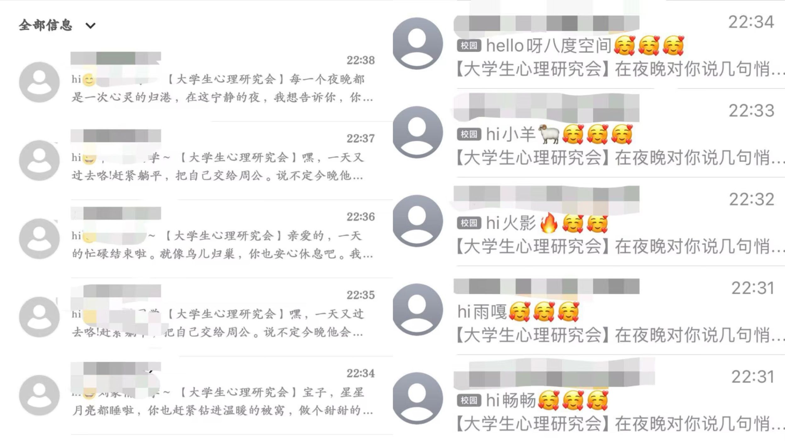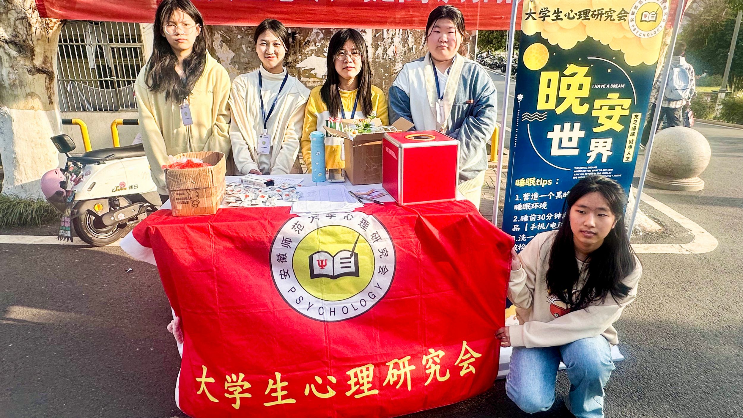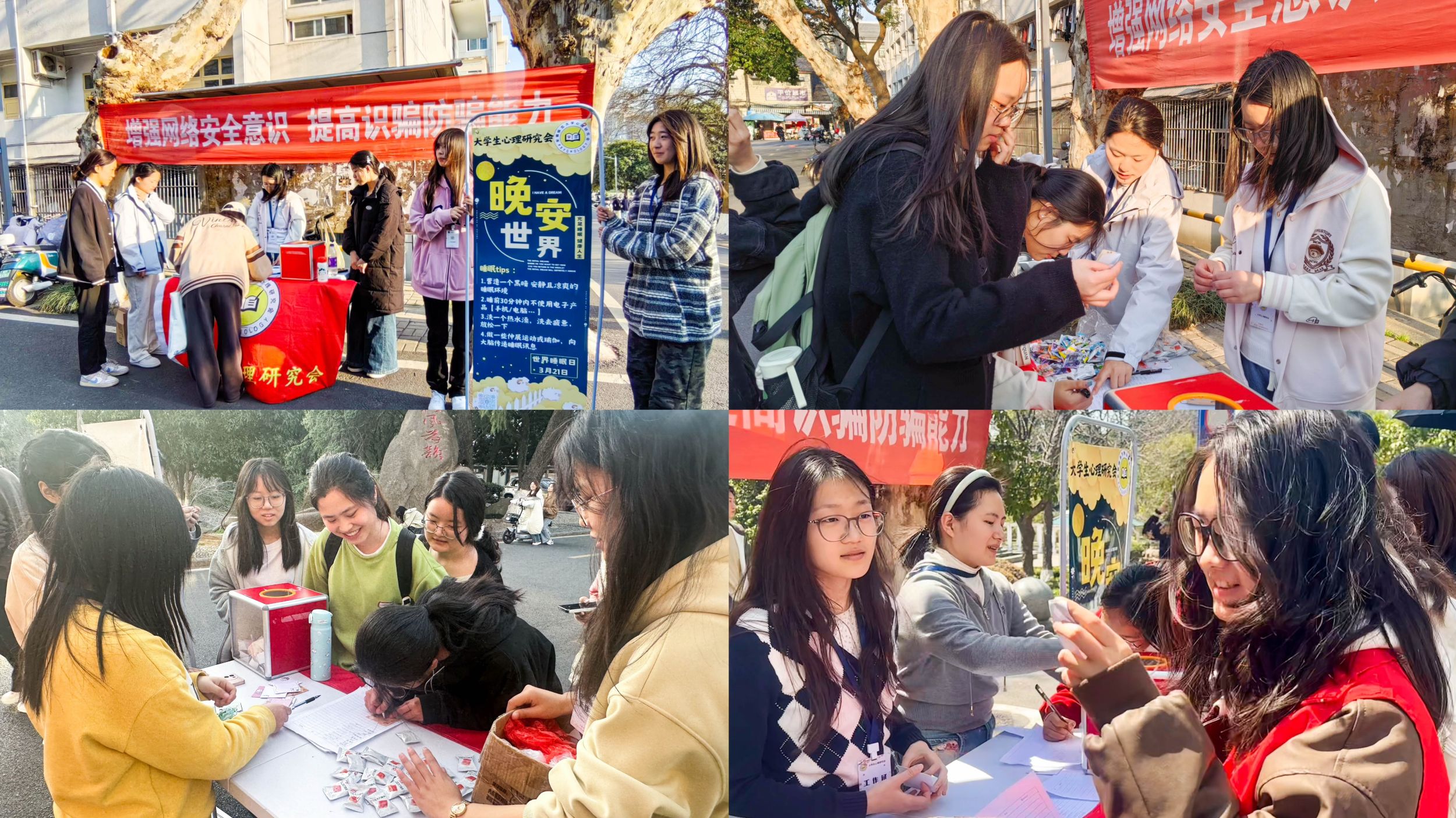 3月20日至3月21日,“晚安短信”活动将本次“321睡眠日”活动推向了高潮。活动当天,老员工心理研究会在食堂广场摆设展台,吸引了两百多名同学参与其中,大家在便签纸上写下昵称和手机号,投入纸箱,随后抽取其他同学的联系方式,在晚上向抽取到的号码发送晚安短信送上好梦祝福,充满了温暖与关怀。老员工心理研究会的工作人员也为所有报名活动的同学发送了官方短信,其中包含助眠小贴士,为同学们送去了一份特别的问候。