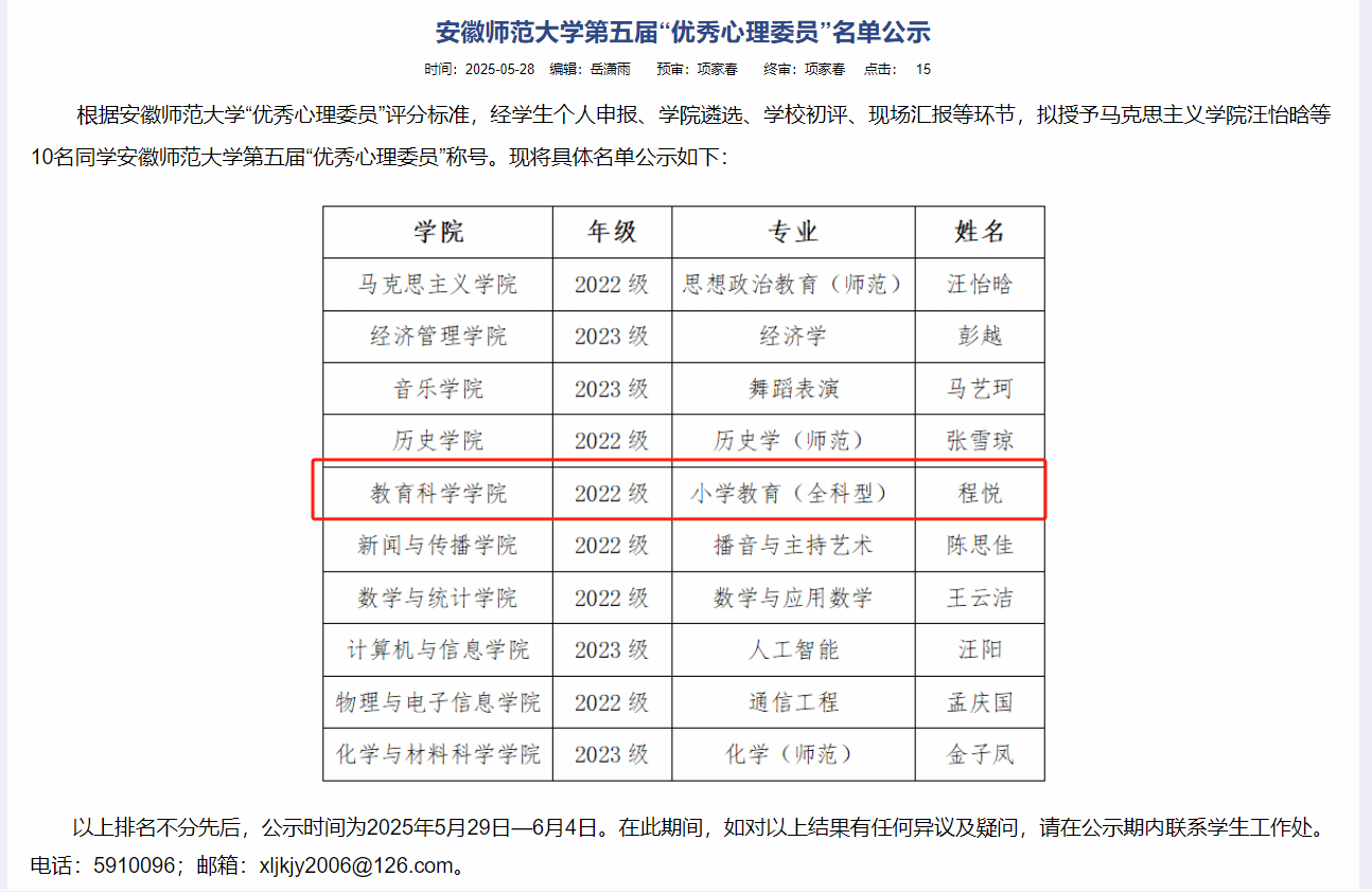 近日,公司第五届“优秀心理委员”展评在花津校区老员工活动中心进行,公司2022级小学教育(全科型)程悦同学在现场展评中获最高分,结合前期支撑材料评选,最终获评公司第五届“优秀心理委员”称号。
