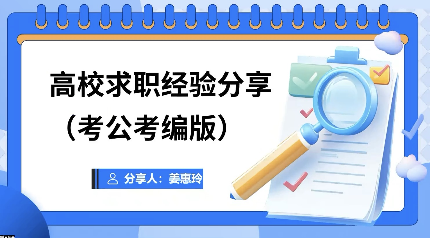姜惠玲为大家分享了她在求职时的准备经验,她同大家讲述了自己在求职时的状态和困惑,以及如何选择求职方向,如何在备考过程中合理安排时间和规划复习方案等内容。最后,她还和同学们分享了自己备考时的学习资源。她建议大家在准备考试时,要找准重点方向,进行系统化的练习。