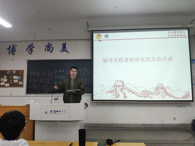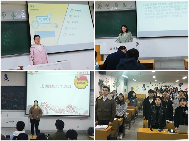 民主投票结束后,推优成功的同学上台表态,一词一句,一言一行,明态度、表决心、受监督,成为推优对象是荣誉,更是责任和使命。大会最后,辅导员程啸老师总结发言,程老师指出“组织上入党一生一次,思想上入党一生一世!”希望所有入党积极分子都能提高思想政治觉悟,加深对党的认识,自觉向党组织靠拢,在成为优秀共产党员的道路上坚定不移地走下去,接受同学监督,不辜负信任,用自身行动为班级团员树立榜样。
