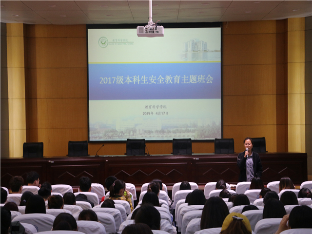 (本网讯 教科院 徐翔)为了增强17级同学的安全意识,防患于未然,教科院于4月17日下午四点半在田楼报告厅召开17级本科生安全教育主题班会,公司党委副书记兼17级辅导员张如华主持班会。