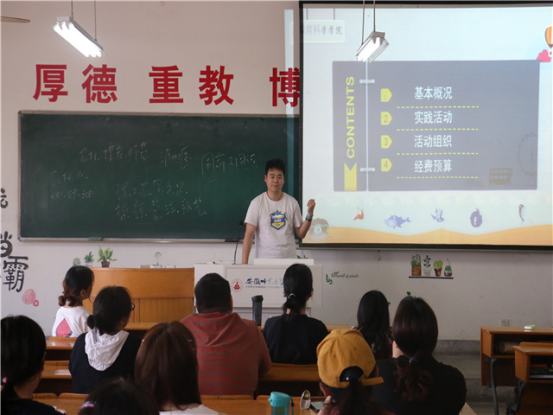 会议伊始,教科院“全心全益”赴芜湖宿州心理服务之肿瘤患者心理状况调研团队负责人何润霄以照顾一位肿瘤患者的心路历程为切入点,分别分析团队工作分配、协作的问题,同时强调社会实践活动爱心和责任心的重要性。随后,教科院“全心全益”赴和县爱心支教团队队长王晨旭结合自身实践经验,讲述了团队前期、中期、后期的工作任务及实践重点,强调各实践团队需统筹全局,做好各团队与实践地的配合工作,查缺补漏。最后,王晨旭队长向与会员工展示了去年社会实践的优秀成果。
