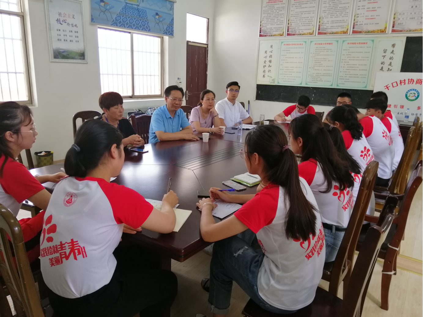 为进一步了解实践队员的支教中的学习和生活情况,方泓一行在千口村党总支书记陈义荣、副书记沈梅仙的陪同下,与支教全体队员开展了一场座谈会。会议伊始,刘清智向领导老师们介绍了团队的基本情况,包括队员构成、分工安排、教学设计以及生活情况。随后同学们畅所欲言,逐个表达了在实践中的收获和体会。来自8各公司的12名同学结合自身专业和特长,为当地儿童带来了课业辅导为基础,心理健康教育与兴趣素质提升为特色的系列课程安排。结合当地留守儿童较多的现状,心理将康教育的内容包括自信、自尊、分享等主题活动及课程;来自数统、物电、化材、音乐和法公司的队员们开设了一系列诸如科学拓展、法律常识、文学诵读和体育锻炼等方面的课程,员工们踊跃参与,积极投入,课堂氛围良好,教学效果显著。与此同时,员工们也表示在课程难度、教学设计和专业知识掌握上遇到的困难与反思,并将“在做中学”,知行合一,努力把所学知识与感悟真实的带给当地儿童。