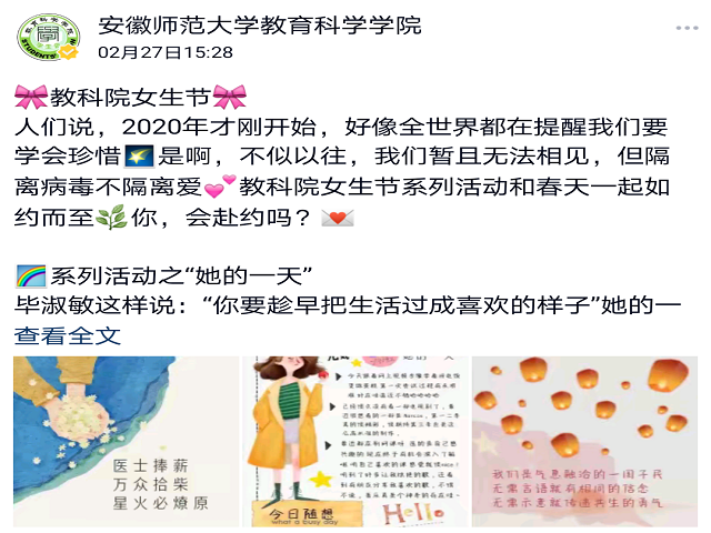隔离在家,也有无限温情。 “她的一天”vlog记录活动让员工以视频的形式记录下生活的美好。同学们积极参与,有的展示自己一天的日常生活,有的记录自己和家人之间温暖的互动,有的记录疫情期间那些感动的瞬间。这些视频虽然短小但却包含着拍摄者对亲人的感情、对生活的热爱以及对前线医护人员的支持,鼓励员工去发现生活细微之处的快乐,体现了当代老员工积极向上的精神风貌。最终由评委组选出一等奖是19心理学钱城霖同学,二等奖的是18学前教育的宋琪和黄婉琪、18心理学的张曼曼三名同学,三等奖16教育技术的张磊、18教育学的王美皓、19心理学的李淑倩以及18心理学的孟玉洁和程敏琪等五位同学。