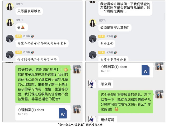 在正式展开调研前,队长冯程在团队群中发布了今年参与心理档案调研的名单,对每位联系员进行了分配,并提出合理性建议,要求联系员在下一阶段前对接成功,收集档案。心理档案可以为公司开展心理健康教育服务工作,建立有效的保障机制,提高员工的心理素质,帮助创建因材施教的先进网络平台,从而促进心理健康教育规范化和迅速发展。多数研究表明农村留守儿童学习倦怠程度要高于非留守儿童,学习倦怠不仅会影响员工的学业成绩,也会影响员工的心理健康,通过对留守儿童心理档案中关于学习倦怠的调查,可以充分掌握不同年龄、性别、人格的留守儿童学习倦怠的差异,为相关深入研究奠定基础。为了保证调研的信度、效度较高,着重强调了对高年级员工调研的针对性。