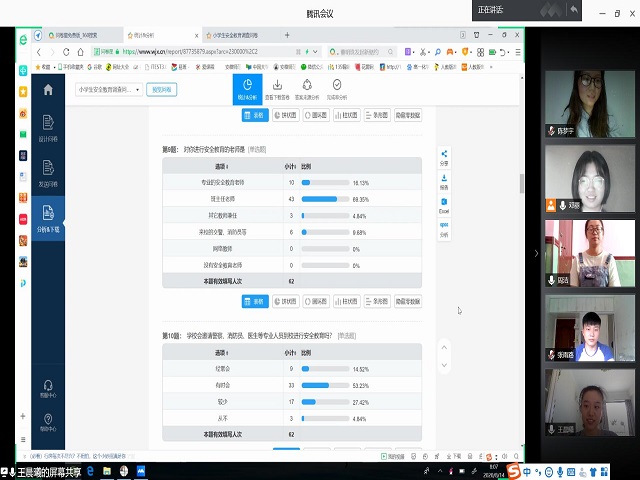 队长邓丽简要介绍了会议内容后,会议正式开始。王晨曦同学首先通过屏幕分享向团队成员展示了问卷结果分析,回应了队长邓丽关于问卷的发放与填写情况的询问,结合当前的结果分析,王晨曦同学提出自己的疑问,其他的队员也就现存问题纷纷发表自己的意见。在完成了问卷与测试题的讨论后,队长邓丽针对如何联系更多的小员工填写问卷这一问题询问团队成员的意见,队员周洁表示可以向在家乡有培训班的小员工发放问卷。队长邓丽积极与和县队伍负责人进行沟通,队员们也正通过各种方式分享问卷,尽力扩大问卷的样本容量。