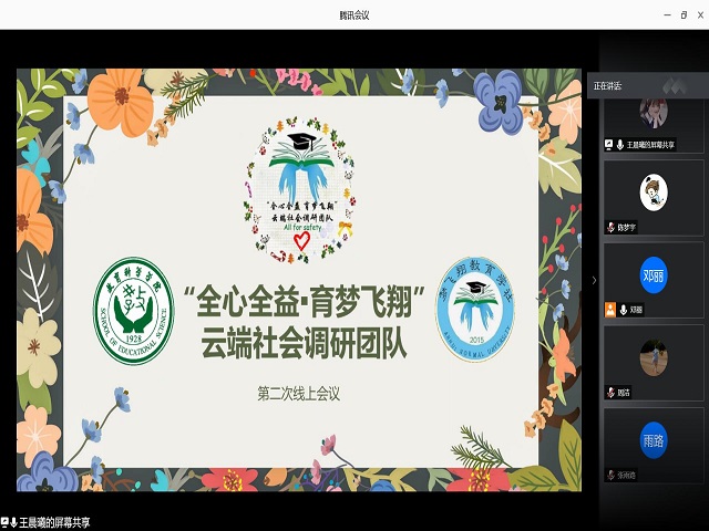 本网讯(教科院 陈梦宇)为提升团队调研能力,充分了解“安全教育”现实状况,保证暑期云端调研工作有序开展,8月14日早7:45,在队长邓丽的组织下,“全心全益–育梦飞翔”团队通过腾讯会议召开了第二次线上会议,周洁、张雨路等四名团队成员参与了此次会议。