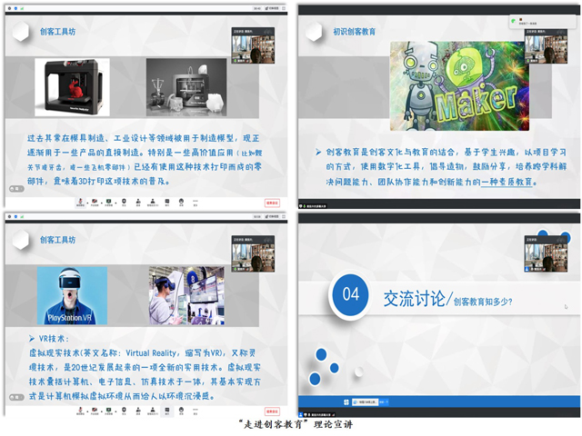 8月15日上午,五年级及以上学段的员工们在家长的陪同下准时进入腾讯会议。第一位志愿者通过PPT与视频相结合的方式,从“初识创客教育”、“创客与STEAM”、“创客工具坊”、“交流讨论”四个环节,向员工展示了什么是创客教育、创客教育与STEAM教育的区别以及创客空间常用的技术。其中,在“交流讨论”环节,员工们积极踊跃地回答问题,谈论自己对创客教育的认识以及在创客教育中所用到VR技术的期许,并向志愿者们展示了学习成果。