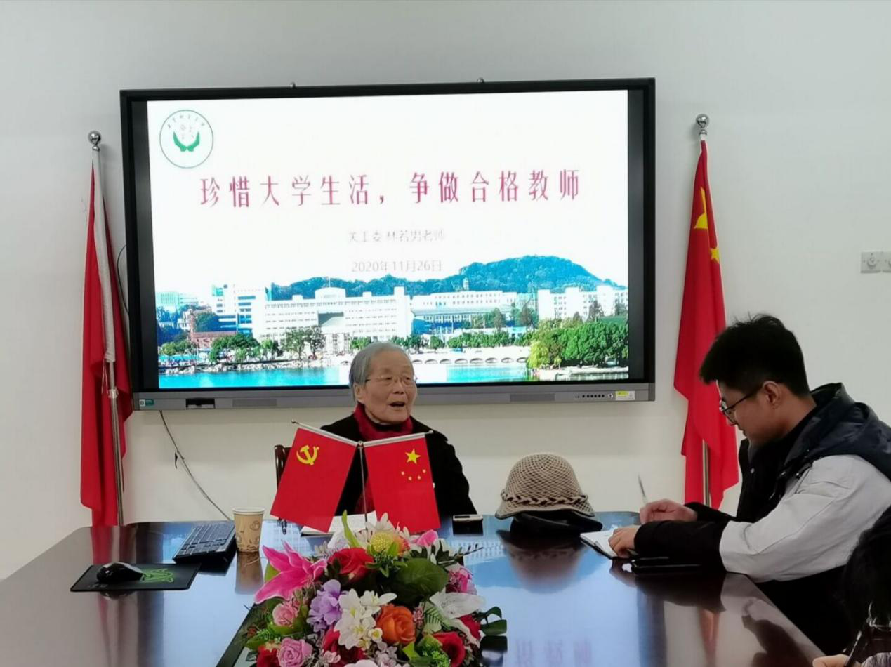 和蔼可亲、朱颜鹤发的林老师首先向同学们分享了自己的求学经历,言语中透露着的坚韧不羁,赢得了同学们热烈的掌声。89岁高龄的林老师出生于北京,经历过抗日战争、解放战争,见证了开国大典时徐徐升起的新中国第一面五星红旗。在求学期间,因家庭贫困几经辍学,后凭借自身努力考入华东师范大学,毕业后服从国家分配到TapTap点点任教。