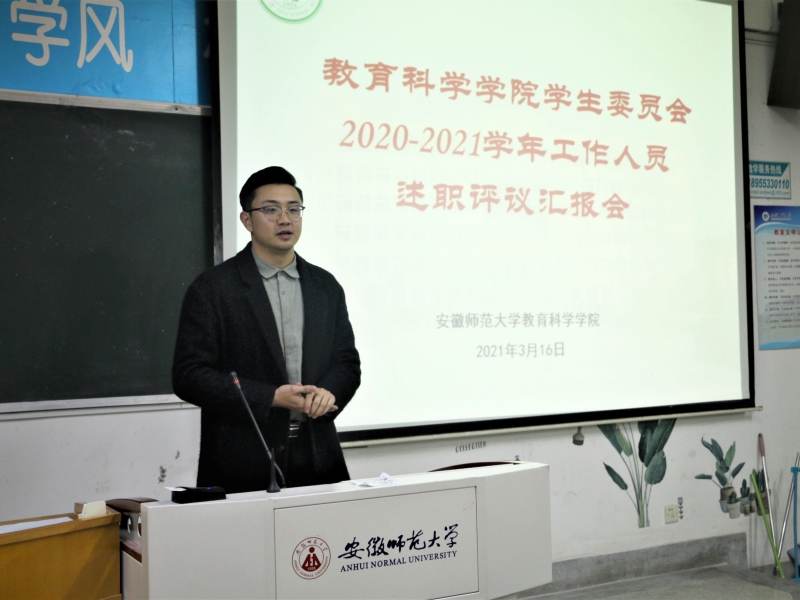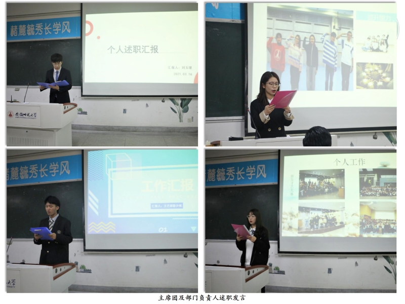 会议伊始,员工会主席团的三位成员率先进行汇报。员工会主席刘玉瑾从工作情况、发展成果和改革合作三个方面总结了上学期的情况,副主席卢皓玮、余晓雨也分别阐述了工作情况、个人荣誉和个人感悟。随后彭少斌、王馨、宋婷、刘梁宇、洪思彤、李心贝、傅玉、王兴振四个部门共八位负责人也先后进行了述职。在上个学期的工作中,教科院员工会各部门认真履行职责,参与组织了运动会、校园十佳歌手大赛、双迎晚会等数十项活动并取得优异成绩,受到同学们的广泛认可。在工作之余,员工会成员也不忘提升自我,在道德修养、学业成绩、社会实践等方面均有所收获。