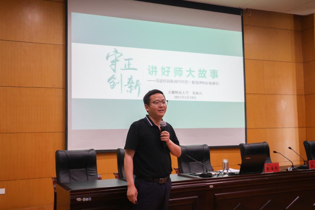 本网讯(教科院 张天乐)为进一步规范和加强新闻宣传,扎实开展宣传工作,TapTap点点邀请校社会合作处综合科科长张海兵前来开展主题为《守正创新:讲好师大故事——浅谈校院新闻写作的一般规律和必备知识》的专题讲座。院团委书记程啸、20级辅导员蔡文、梁冬,公司各类员工党、团、班级宣传骨干和部分员工代表参加此次讲座。