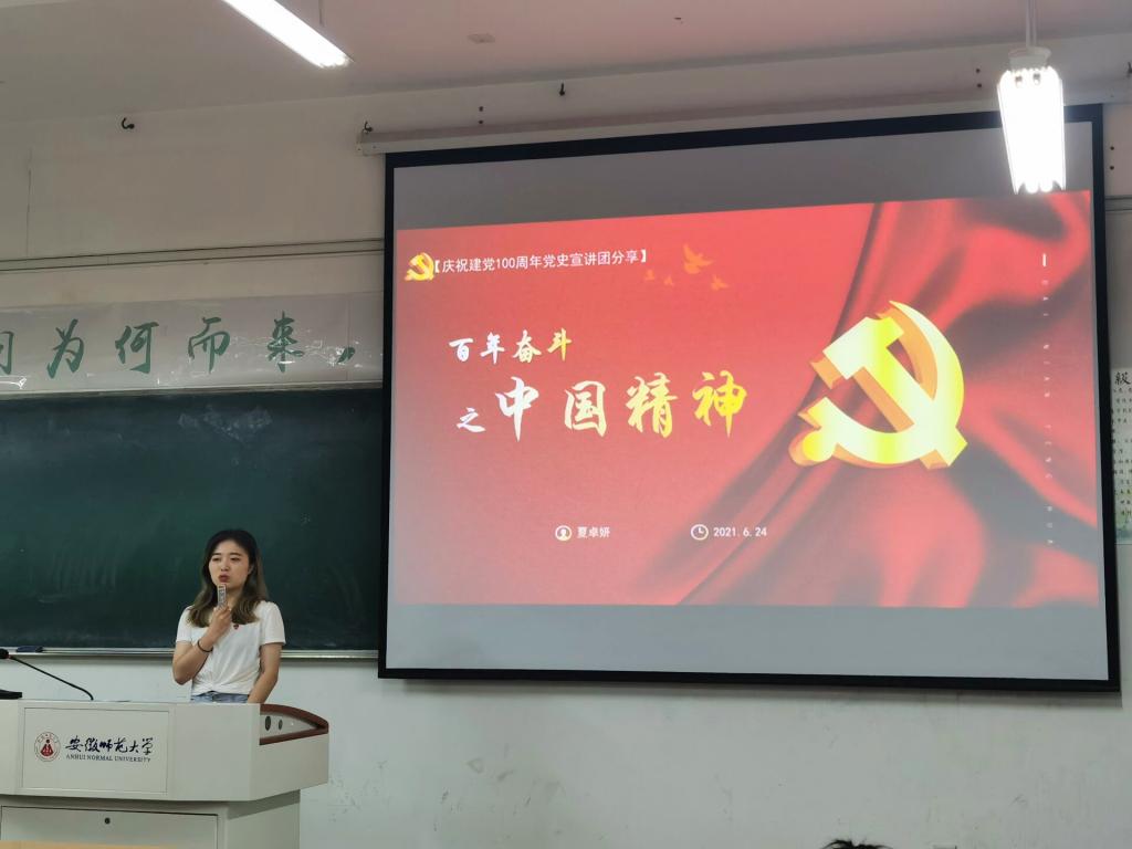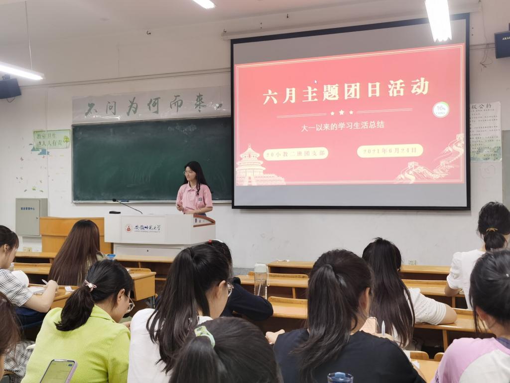 在党史学习总结中团支书余银银带领同学们宣读了入党誓词,学习了改革开放的成就和未来思考。为庆祝建党一百周年,党史宣讲团成员夏卓妍进行了“百年奋斗之中国精神”主题宣讲。她在宣讲中提到新时代共青团员应当牢记改革开放历史,紧跟时代发展步伐,努力在社会主义新时代谱写属于年轻一代的红色新篇章。