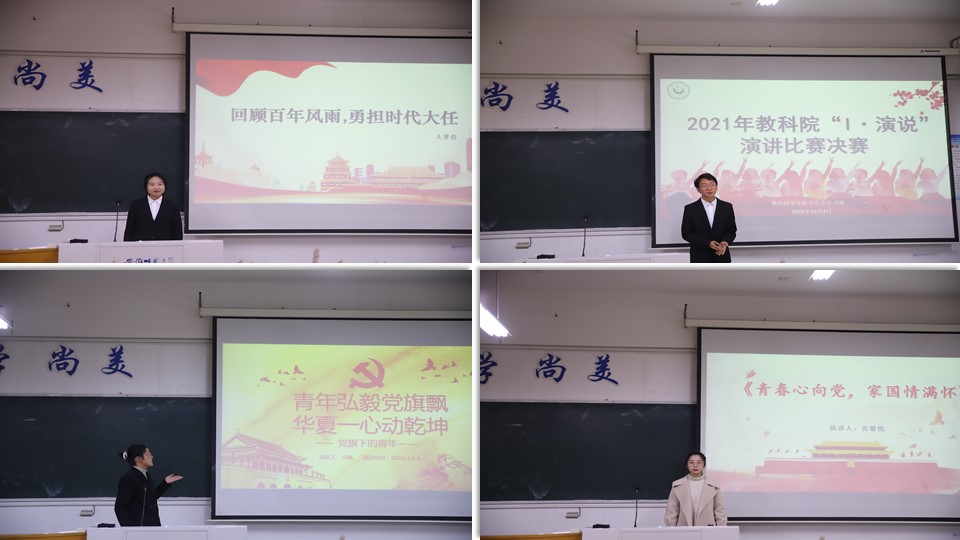 12月3日晚,“I·演说”演讲比赛决赛在田楼8408教室举行。决赛分为主题演讲与即兴演讲两个环节,院团委书记程啸、副书记蔡文、覃伊涵,院团委员工会主席团成员任子贤以及2020年演说比赛获奖选手2019级学前教育专业王轩同学担任比赛评委。“一百年风雨兼程,几十载青年奋进”“青春弘毅党旗飘,华夏一心动乾坤”“回顾百年风雨,勇担时代大任”……同学们在字正腔圆、铿锵有力的演讲中抒发了自己对党和国家的热爱。