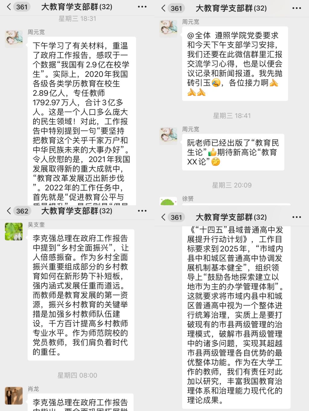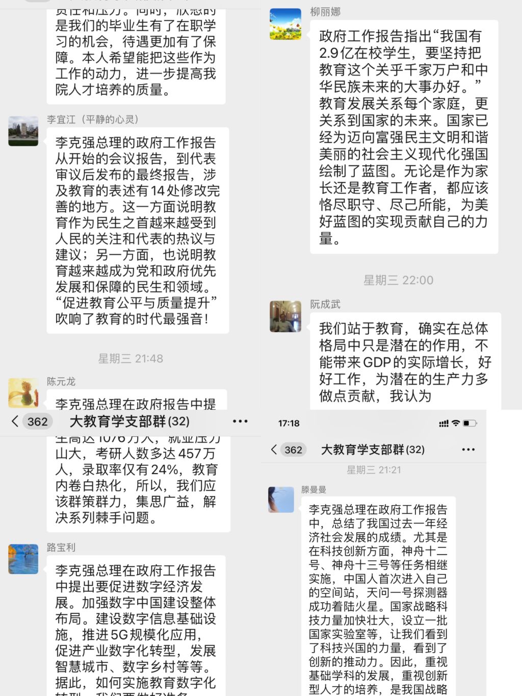 笃行不怠,行稳致远。通过此次线上理论学习与交流反思,教育学教工党支部全体党员能以两会精神为指引,切实增强使命感和责任感,干在实处,走在前列,为教育事业高质量发展贡献力量。