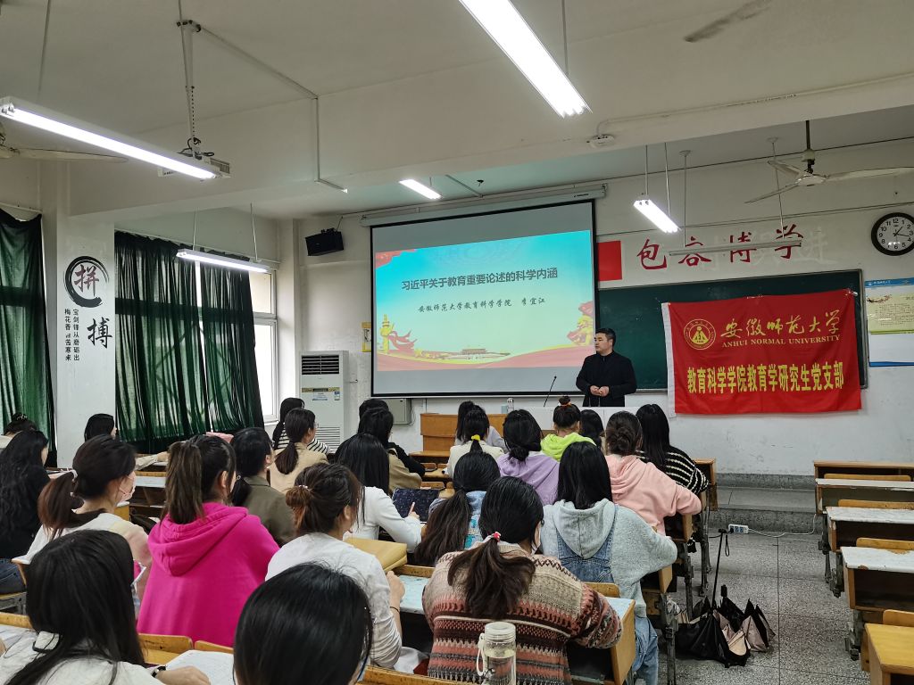 李宜江指出,习近平总书记在2018年9月10召开的全国教育大会上发表的重要讲话,对教育工作提出了一系列富有创见的新理念新思想新观点,系统回答了一系列方向性、全局性、战略性重大问题,形成了习近平总书记关于教育的重要论述。这次讲话立意高远、内涵丰富、思想深邃,具有很强的理论性、政治性、战略性,是指导新时代教育改革发展的纲领性文献,更是教育学研究生党员需要深刻学习把握的内容。