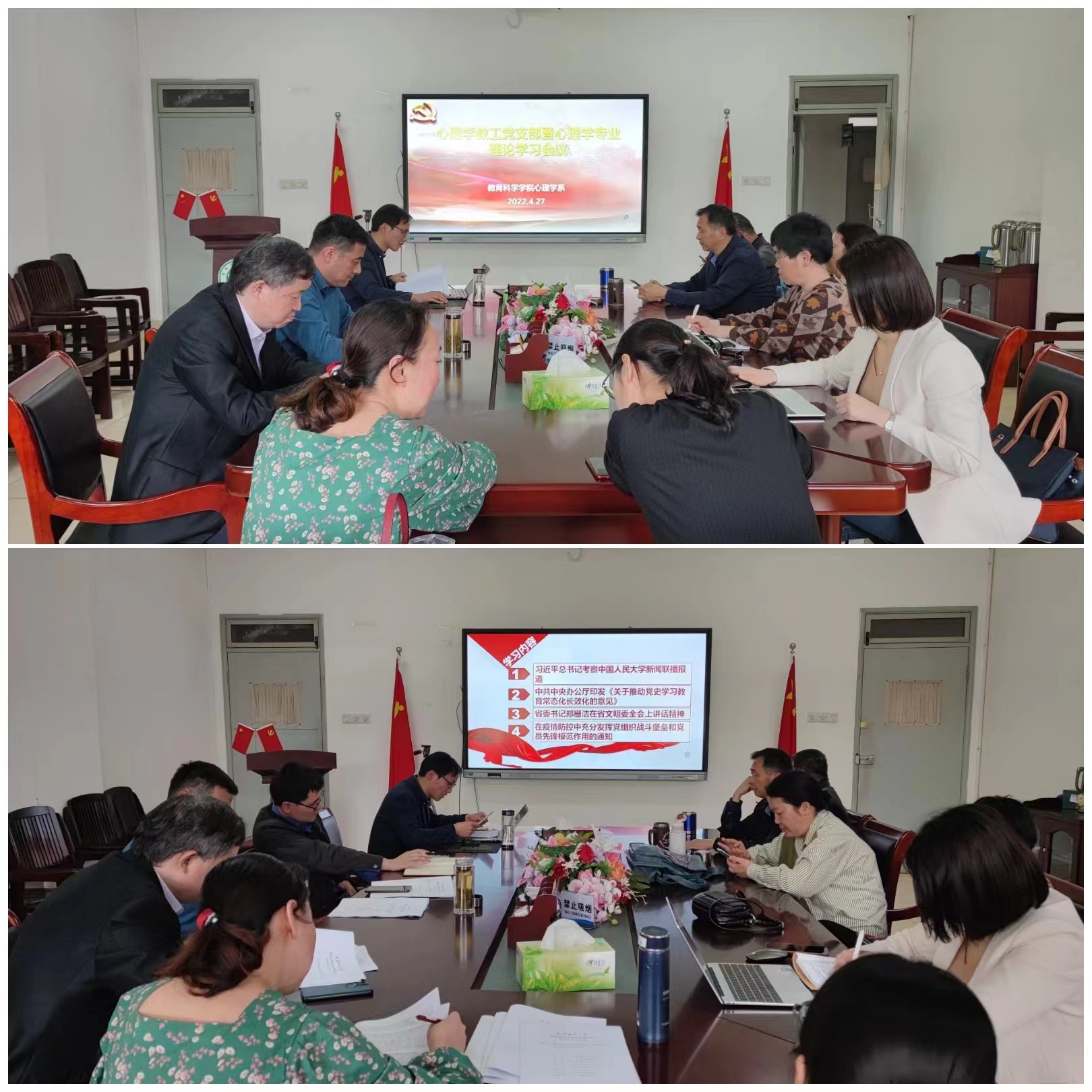 4月27日下午,根据公司党委的安排,心理学教工党支部及全体专业教师在公司308会议室集中开展理论学习活动。学习内容包括习近平总书记在中国人民大学考察时的讲话精神(新闻联播报道)、中共中央办公厅印发《关于推动党史学习教育常态化长效化的意见》、省委书记郑栅洁在省文明委全会上讲话精神、公司党委组织部关于在疫情防控中充分发挥党组织战斗堡垒和党员先锋模范作用的通知等。会议由支部书记、专业负责人王礼军副教授主持。