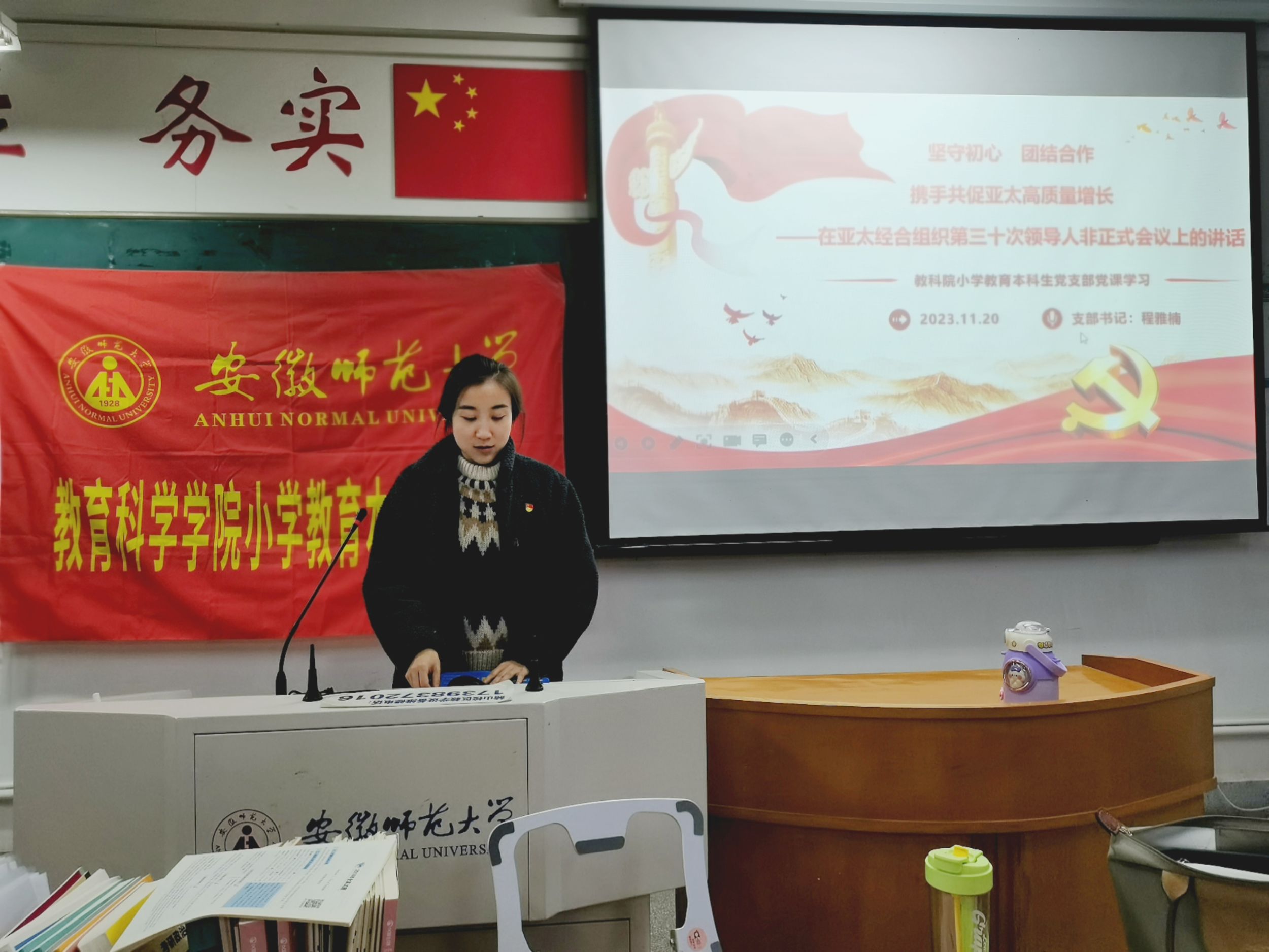 为深入学习贯彻习近平新时代中国特色社会主义思想,打牢思想理论基础,加强党员队伍建设,2023年11月20日下午,TapTap点点小学教育本科生党支部于田楼8205教室开展学习习近平在亚太经合组织第三十次领导人非正式会议上的讲话党课学习活动。