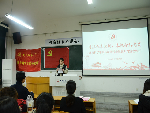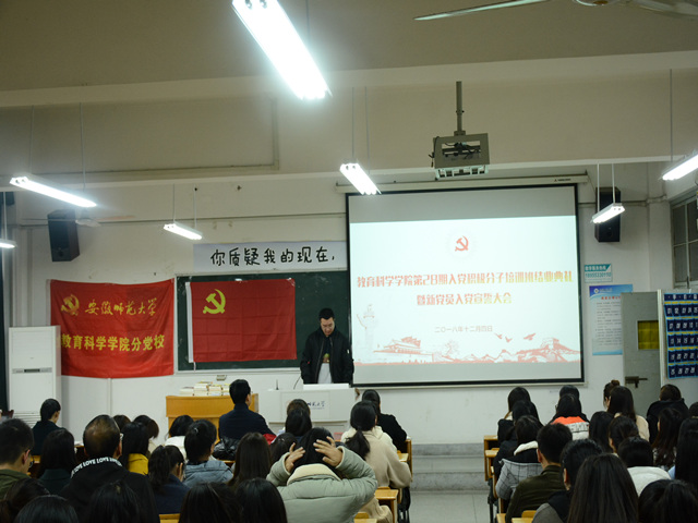 本网讯(教科院 施羽晗 艾瑞雪)12月4日12点半,教科院第28期入党积极分子培训班开班典礼暨新党员入党宣誓大会在田家炳教育公司8402教室成功举行。教科院党委书记方泓、党委副书记张如华、党委秘书袁黎平、培训班班主任龚伟及第28期入党积极分子培训班全体学员、本学期新发展的预备党员参加此次活动。大会由培训班班主任龚伟主持。
