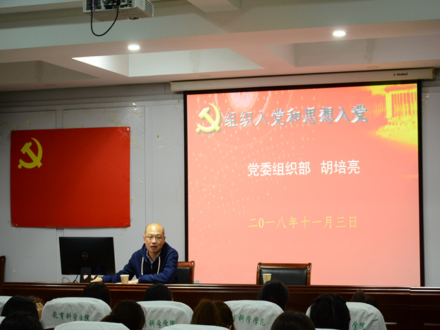 本网讯(教科院 施羽晗 艾瑞雪)为了端正入党积极分子的入党动机,使培训班学员们明确入党程序。11月3日晚七点,公司特邀公司党委组织部正处级组织员胡培亮在院学术交流中心为培训班学员们开展以“ 组织入党和思想入党”为主题的党课。培训班全体学员参与本次党课学习活动,活动由培训班班主任龚伟主持。