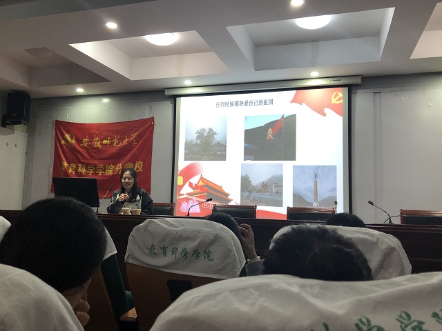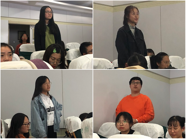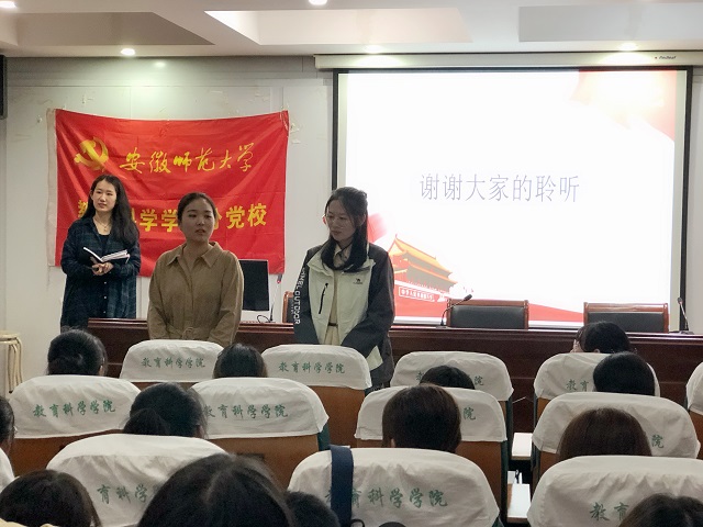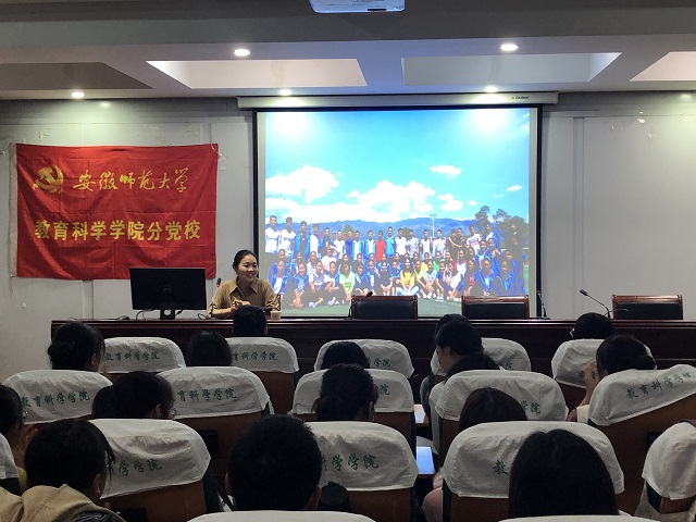 伊始,由谭茹轩老师简单介绍两位研究生学姐,并对其表示热烈欢迎。第一位主讲人宁嘉惠以“扶贫——扶智——扶志”为主线,用亲身经历为大家讲述支教的意义,以其真切感悟打动了在场的学员。第二位主讲人苏镇东则以“在实践中学习,做合格的党员”为主题,从在实践中学习批评和自我批评、做好自己的本职工作以及任何时候都热爱自己的祖国三方面展开,结合自身支教经验,激励学员们要在实践中找寻自身价值。