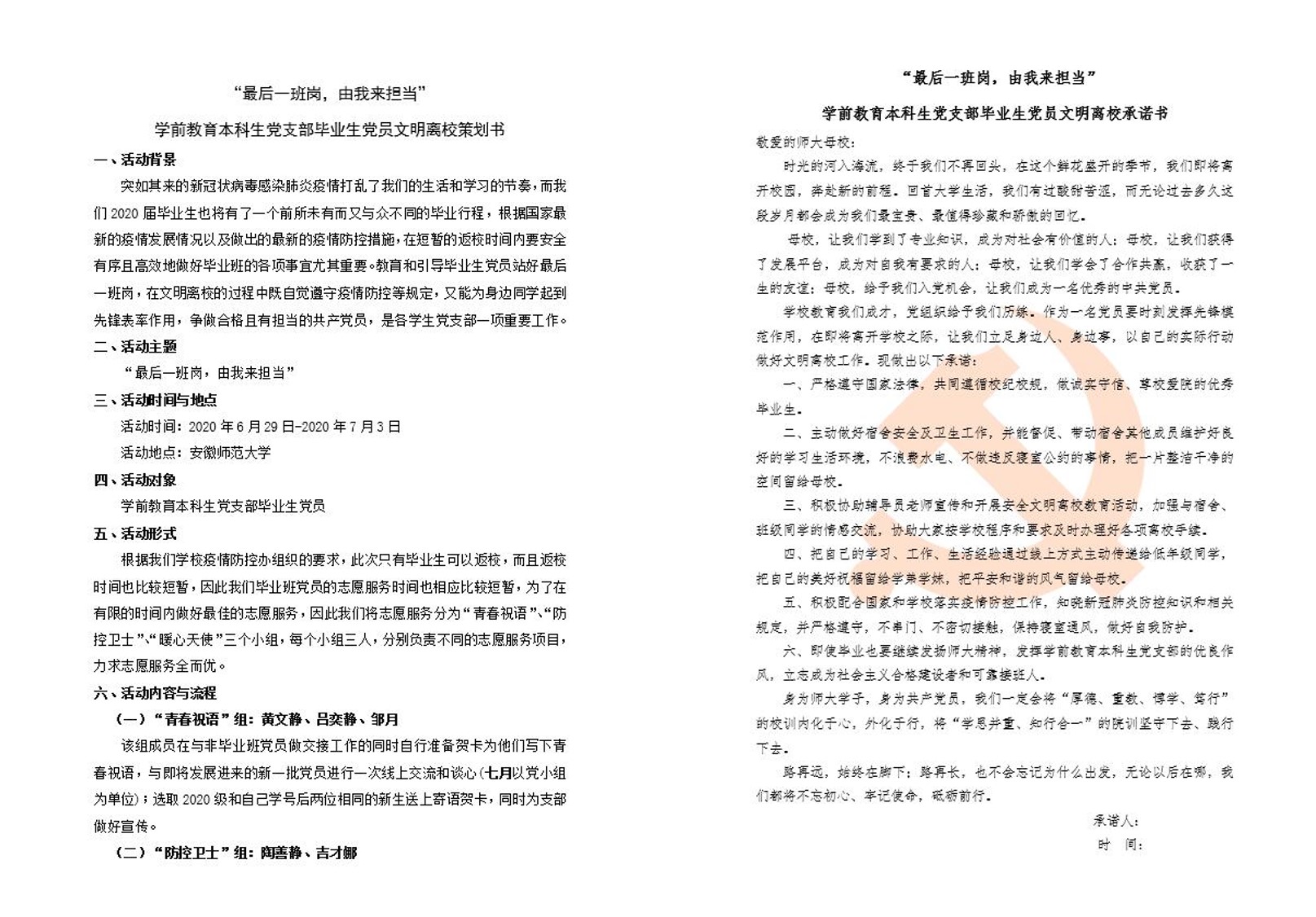 因疫情的特殊原因,学前支部同学及时策划了“最后一班岗,由我来担当”——毕业生党员文明离校活动。为在有限的时间内做好最佳的志愿服务,大家自觉成立了“青春祝语”“防控卫士”“暖心天使”三个小组,分别负责不同的工作项目,力求志愿服务全而优。