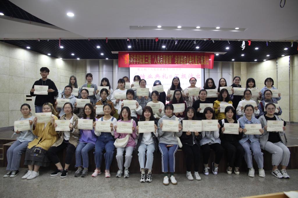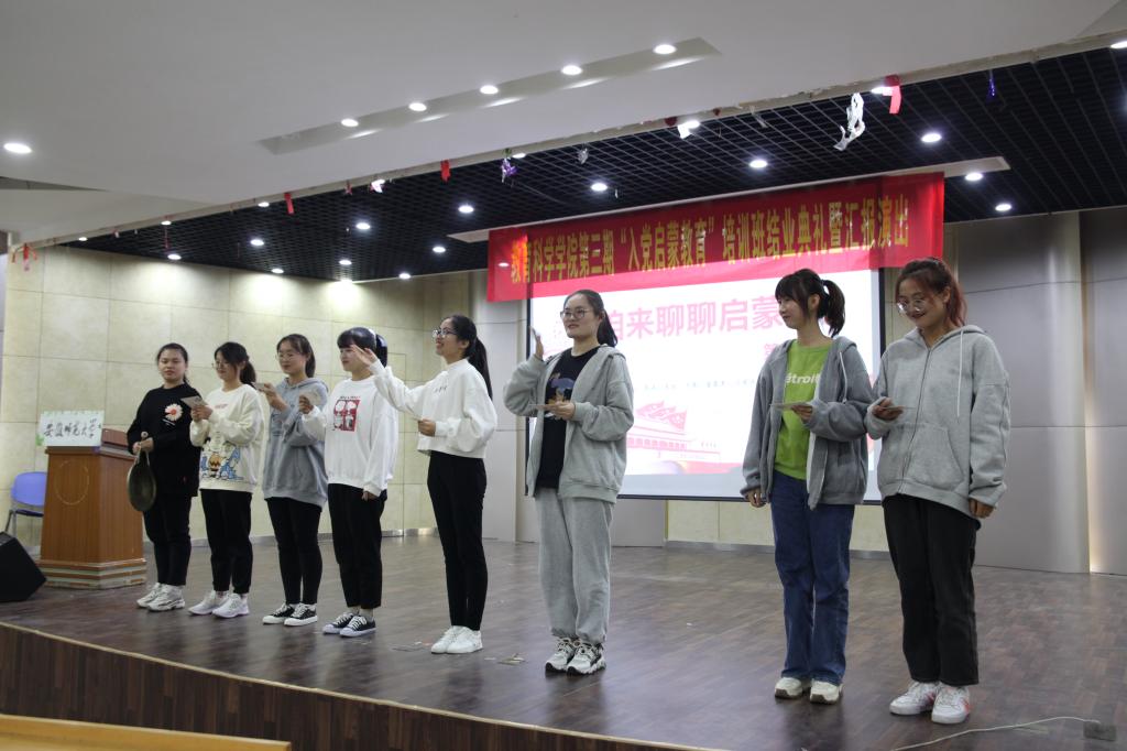 首先,在场所有人跟随视频一起回顾了第三期学员的启蒙班生活,视频里不断出现理论课学习、考察会和志愿服务等令人难忘的属于启蒙班的回忆。随后,五个大组依次进行汇报演出,第一组的节目是《三句半——咱来聊聊启蒙班》,每个人用简短的话语以及诙谐的语气与大家分享了她们多姿多彩的启蒙班生活;第二组《我和启蒙班的日子》,从几人制作的简短小视频和分享的感悟里可以看出她们的成长,从刚进启蒙班的青涩到后来的游刃有余,最后到结业和汇报演出的稳重;第三组的情景剧《玉汝于成》是关于爱、关于感恩、关于成长的蜕变,在几位同员工动的演绎下展现了当代老员工自强不息、心怀感恩的成长历程;第四组的诗朗诵《我的祖国》以及第五组的手语表演《国家》,都展现了“家是最小国,国是千万家”的家国情怀,是每个人加入启蒙班的初心和为之奋斗的使命。