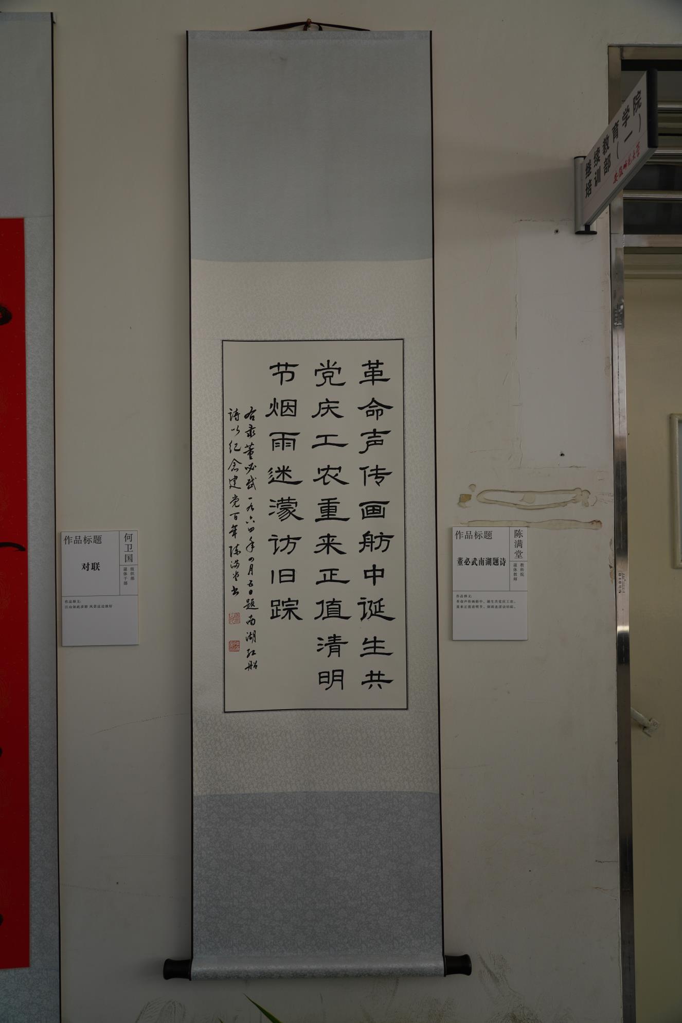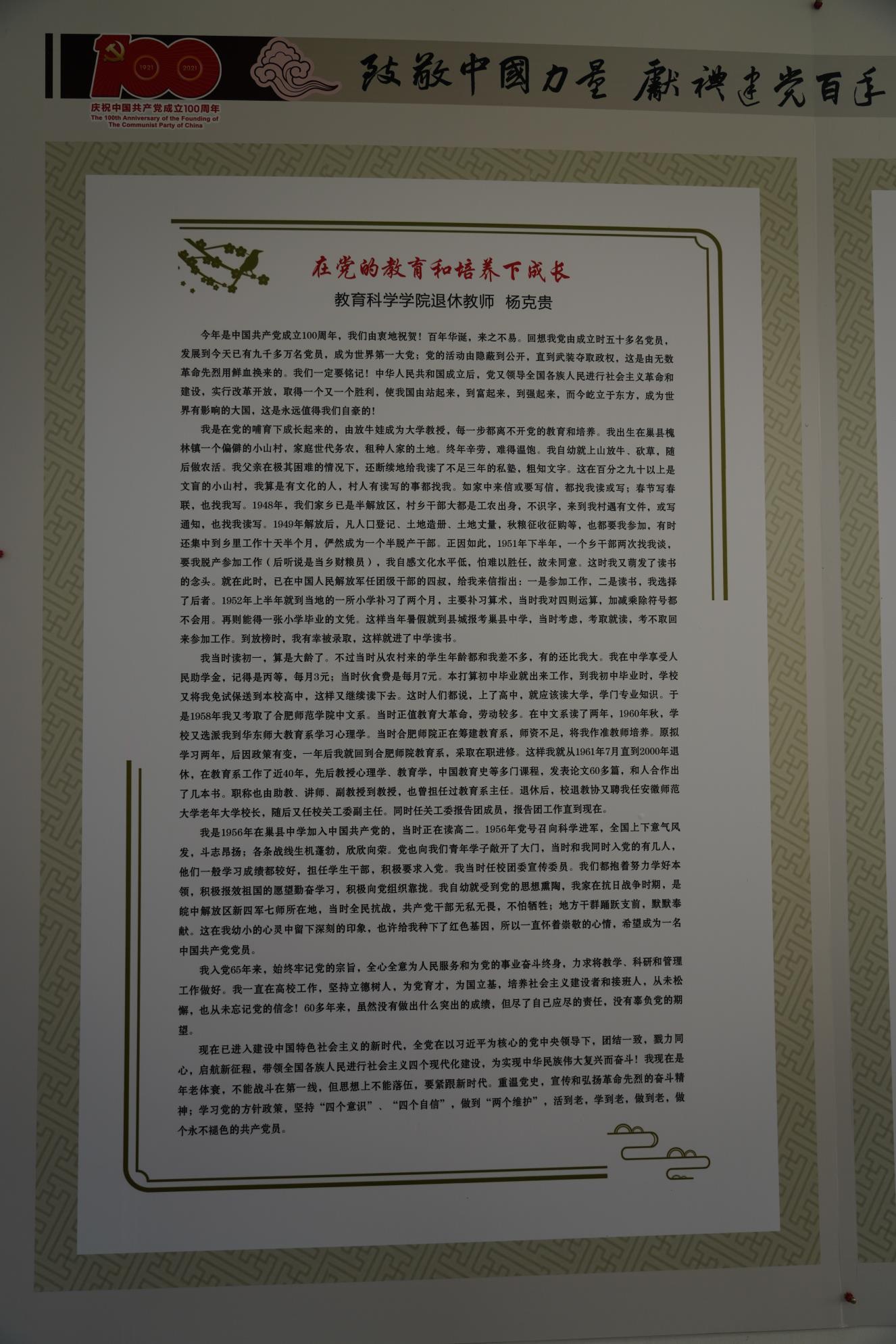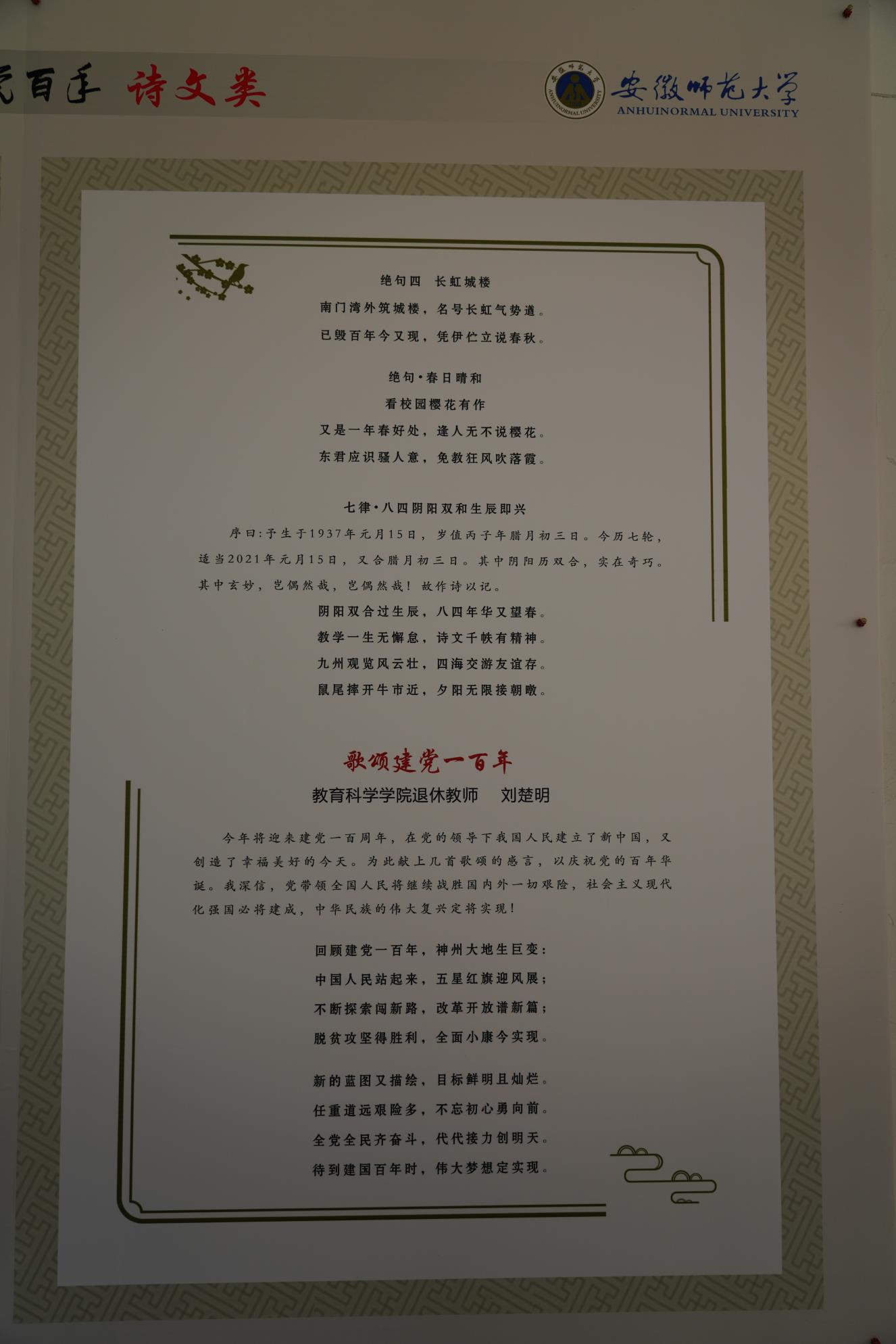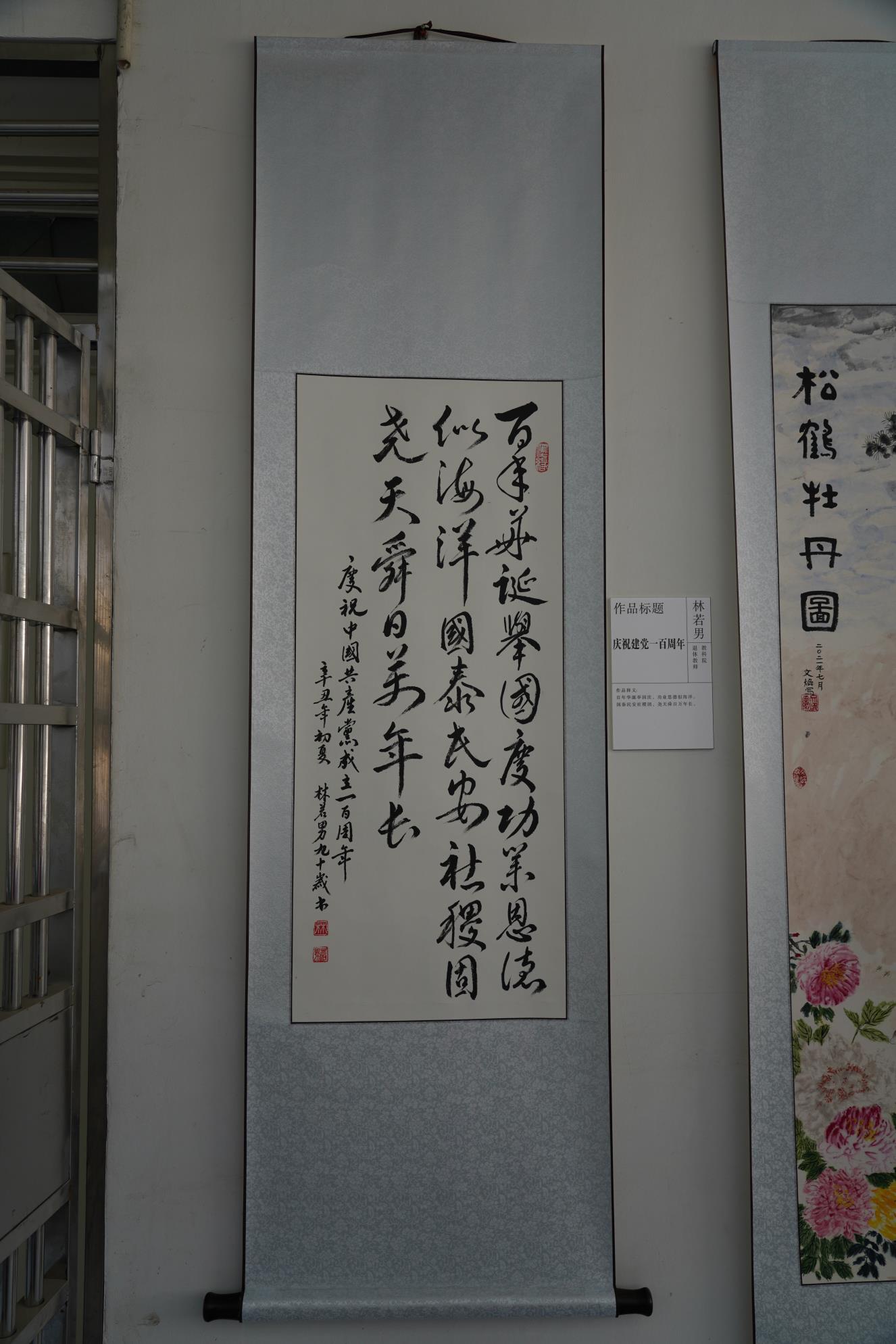 本网讯(院退教协 王守恒)在喜迎中国共产党成立100周年之际,由校离退休工作处和校退教协主办的“致敬中国力量,献礼建党百年”离退休教职工诗文、书画、摄影展日前顺利落下帷幕。此次展览活动是全校离退休教职工向中国共产党百年华诞献上的一份厚礼,活动开展以来,公司退休教工党支部、退教协分会在公司党委的领导和支持下积极组织退休教师参与此项活动,得到了老同志们的积极响应。本次展览全校共展出作品124篇(幅),其中教科院退休教师参展的作品15件,占所有参展作品的12%,不仅在参展单位中参展的作品数量最多、类型最全,包括杨克贵、刘楚明、王守恒老师的诗文作品5篇(首)、林若男、陈满堂老师的书画作品4幅、杨先海、庞世焕老师的摄影作品6幅。参展作品内容丰富、主题突出,或讴歌党的丰功伟绩特别是教育变革的光辉历程,或反映伟大祖国发展的精彩瞬间,或联系自身成长的过程感念党的培养教育之恩,用丹青妙笔表达对伟大祖国未来的期盼和衷心祝愿,凝聚着老同志对幸福生活的赞美,展现了老同志们奋斗不息、昂扬向上的精神风貌,受到展览组织者和广大观众的好评。