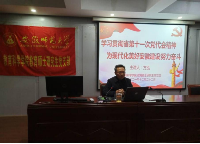 12月22日下午,院党委书记方泓在教科院313学术交流中心以“学习贯彻省第十一次党代会精神,为现代化美好安徽建设努力奋斗”为主题的专题党课,教育硕士研究生党支部书记、支委成员、党员以及预备党员认真聆听,共同参与学习。
