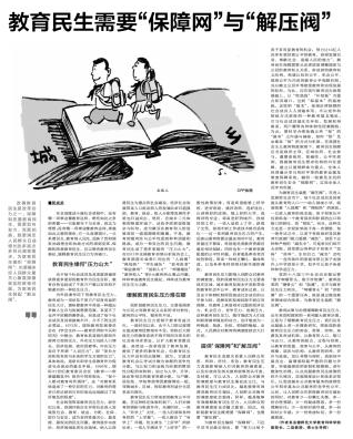 阮成武教授在《教育民生需要“保障网”与“解压阀”》一文中,从内外因素作用下的教育民生压力和社会转型带来教育民生压力两个方面,回答了教育民生缘何“压力山大”。指出现阶段缓解教育民生压力的难点,主要是国家与公民之间教育权义关系的非对称性,教育的公平性、福利性不足。最后,文章认为保障和改善教育民生,需要双向发力、双面拓展。既要满足人民群众日益增长的多层次多样化教育需求,为教育民生编织“保障网”;也要解决好人民群众最关心最直接最现实的教育问题,为教育民生装配“解压阀”。