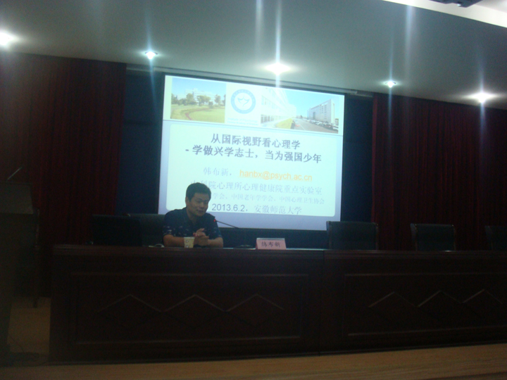 本网讯(教科院 朱海霞)6月2日上午,中国科公司心理研究所博士生导师韩布新教授应邀来公司作《国际视野中的心理科学研究》学术报告,本次报告为皖江心理大讲坛系列讲座第25讲。心理学系全体教师、心理学专业研究生及部分本科生聆听了本场报告会。报告会由经理葛明贵教授主持。