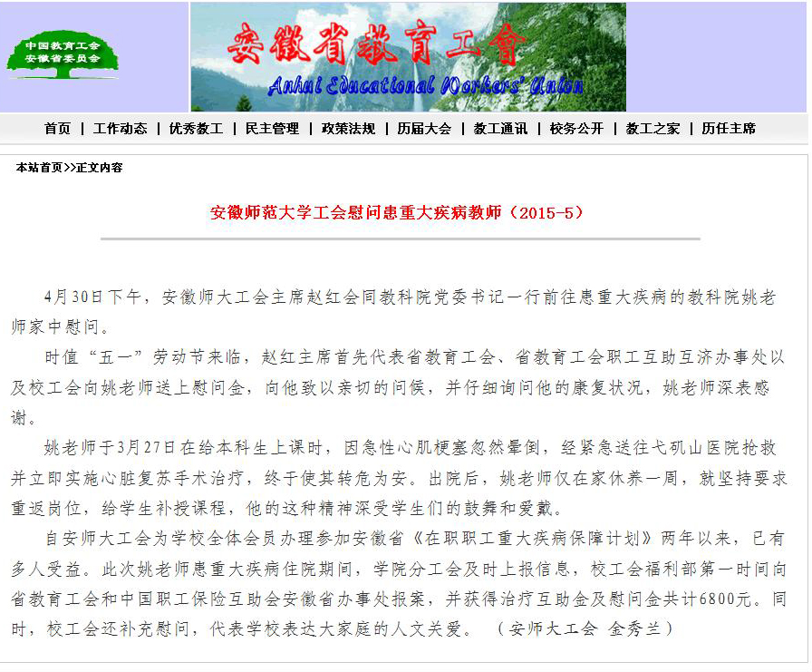自校工会为全体会员办理参加安徽省《在职职工重大疾病保障计划》两年以来,已有多人受益。此次姚老师患重大疾病住院期间,公司分工会第一时间上报信息,校工会及时向省教育工会和中国职工保险互助会安徽省办事处报案,并获得治疗互助金及慰问金共计6800元。4月30日下午,校工会主席赵红会同公司党委书记刘晓宇一行前往姚老师家中慰问,并向其补充慰问1000元。